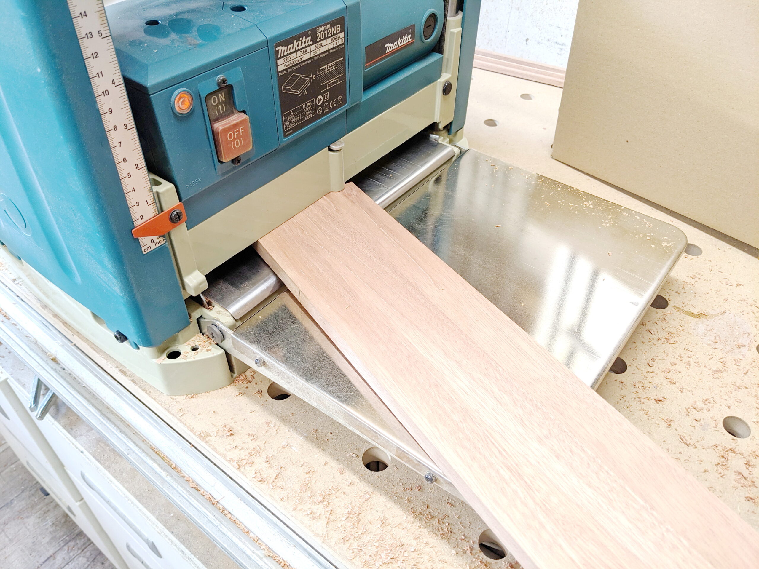 Die Eichenplanke habe ich zunächst auf der Tischsäge gefügt und anschließend mit dem Dickenhobel von Makita auf die gleiche Stärke wie die anderen Plattenteile gebracht.