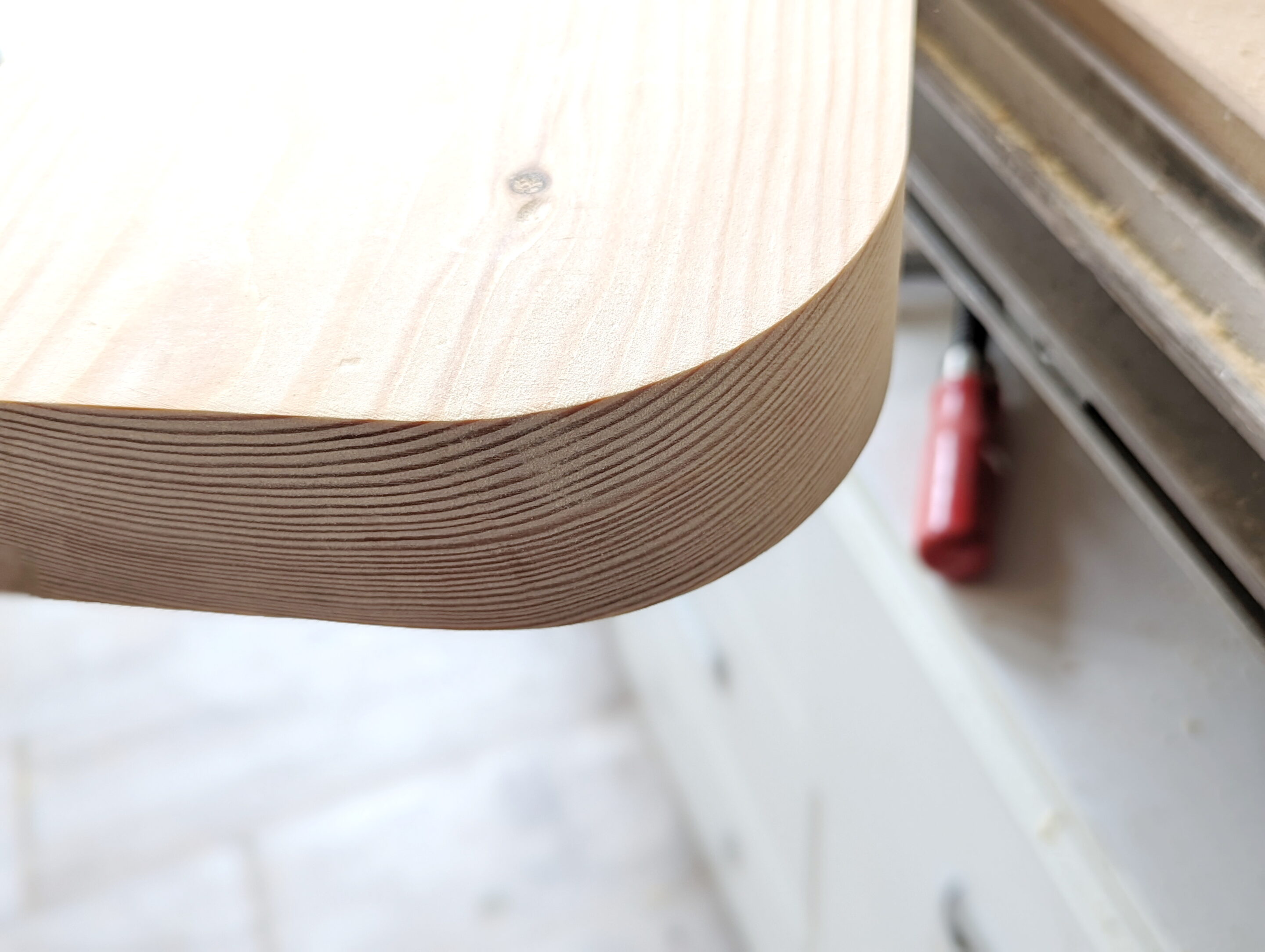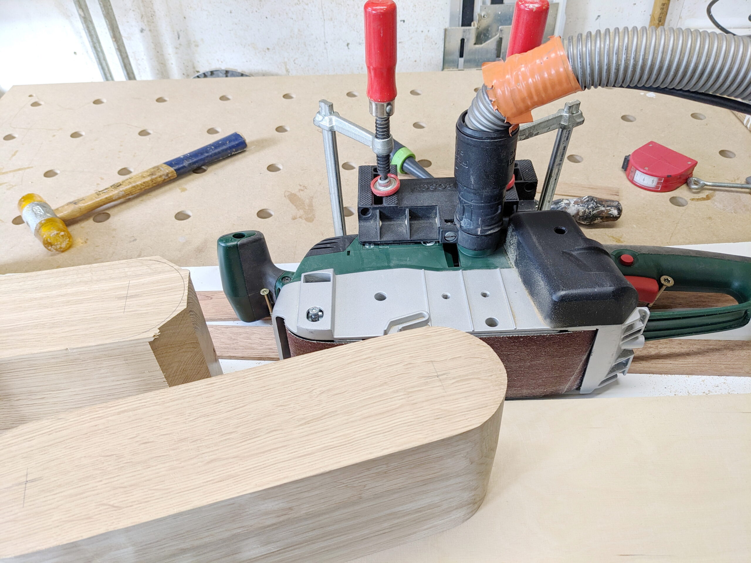 Die Rundungen habe ich nach dem Anzeichnen zunächst grob mit der Kappsäge zugeschnitten. Die endgültige Form entstand danach am Bandschleifer, noch ohne Bandsägestation.