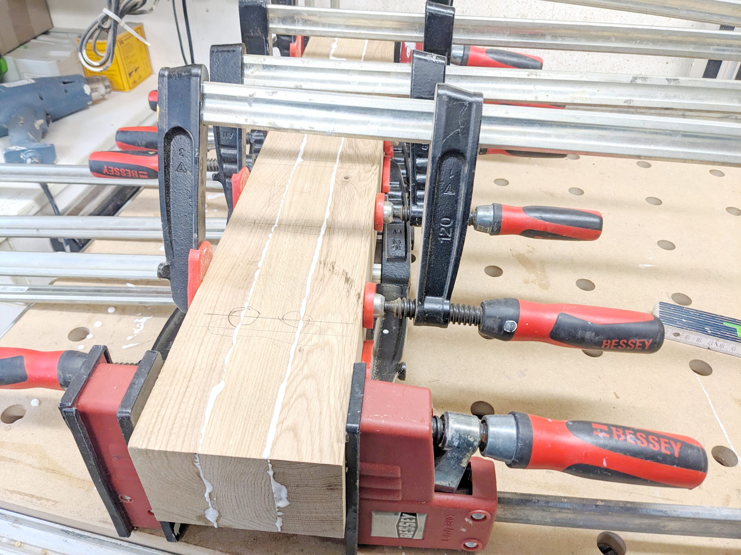 Die Eichenplanken habe ich zunächst grob auf der Tischsäge zugeschnitten und anschließend auf gleichmäßige Dicke gehobelt. Genau musste es dabei noch nicht sein – wichtig war nur eine saubere Grundlage für das spätere Leimholz.