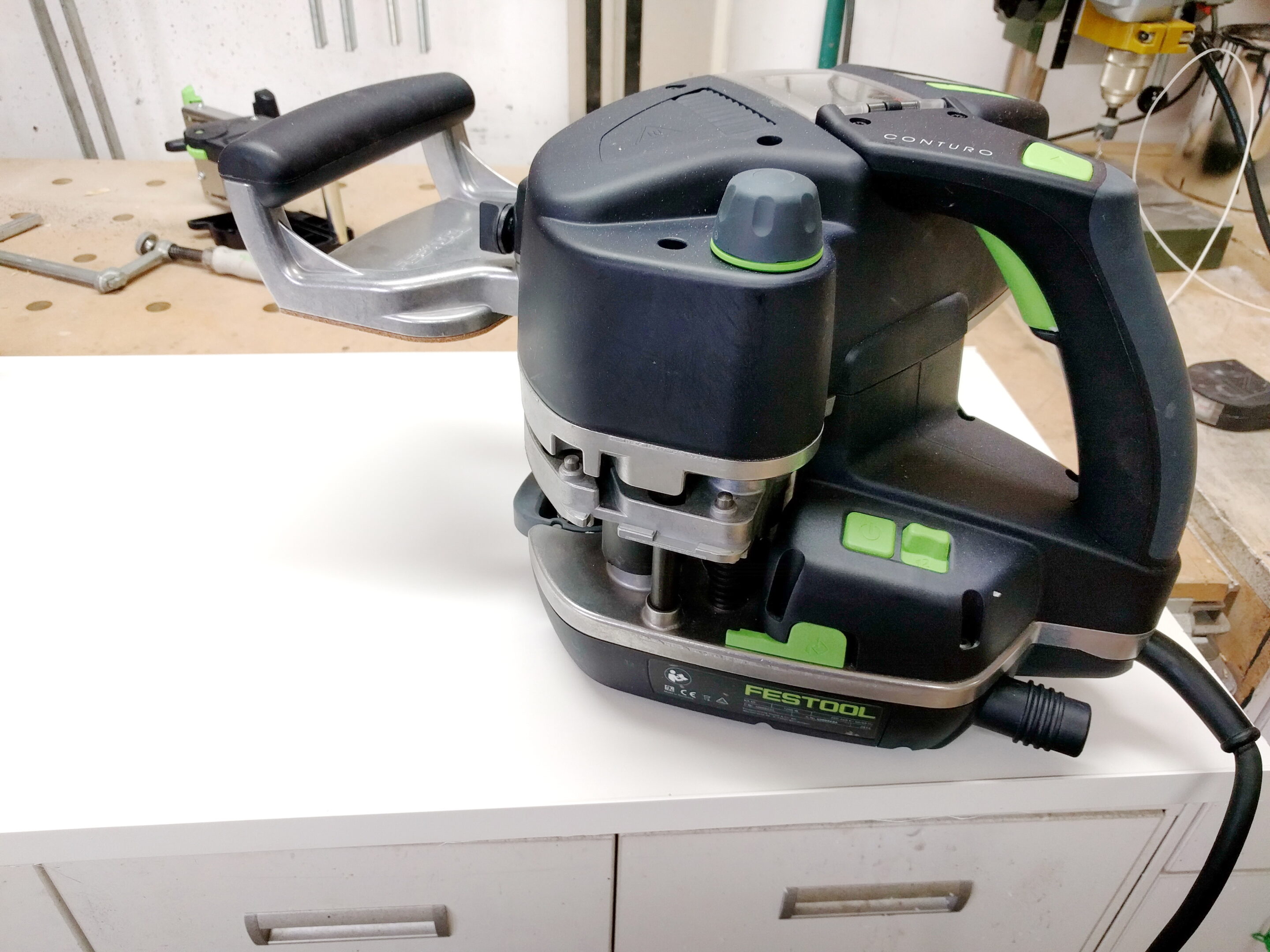 Das ständige Auswechseln und Einrichten des Fräsers wäre auf Dauer zu aufwändig. Deshalb lasse ich den Fräser dauerhaft in der Oberfräse montiert.