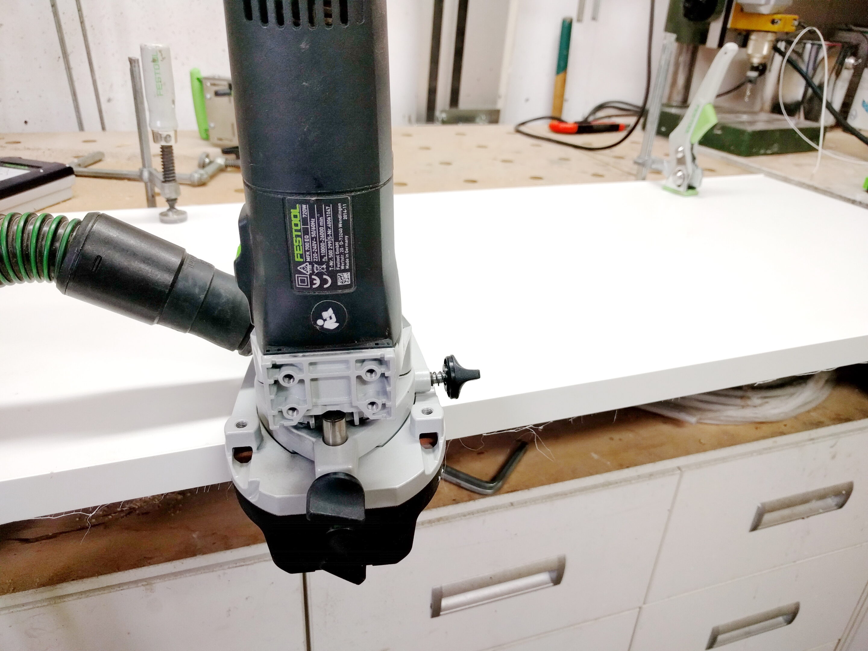 Bei dieser Kante lässt sich beides gleichzeitig mit der Festool MKF 700 erledigen. Diese Oberfräse nutze ich ausschließlich für die Bearbeitung von ABS- und Echtholzkanten nach dem Verleimen.