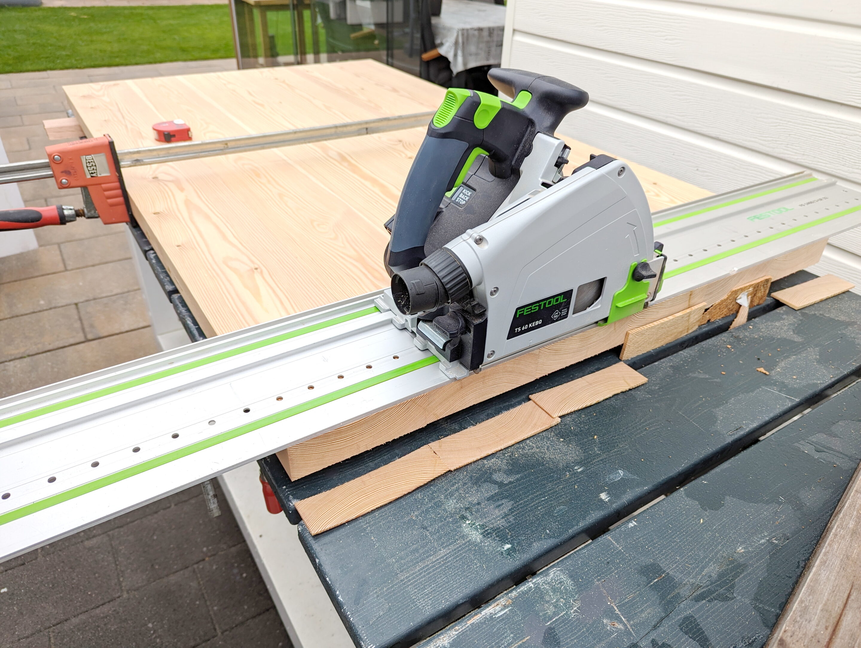 Deshalb habe ich stattdessen die Festool TS 55 mit einem scharfen Sägeblatt verwendet. Zunächst ziehe ich einen etwa 1 mm tiefen Rückwärtsschnitt entlang der späteren Schnittkante. Dadurch werden mögliche Ausrisse beim eigentlichen Sägen weitgehend verhindert.