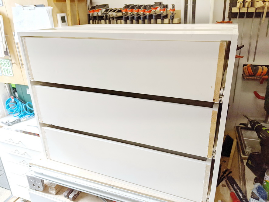 Für das Ausrichten und Verschrauben von Schubladenfronten gibt es verschiedene Methoden: Die einen schwören auf Doppelklebeband, die anderen auf spezielle Schubladenzwingen. Ich persönlich habe beides nie gebraucht – meine Fronten waren bisher auch ohne diese Hilfsmittel immer gerade.