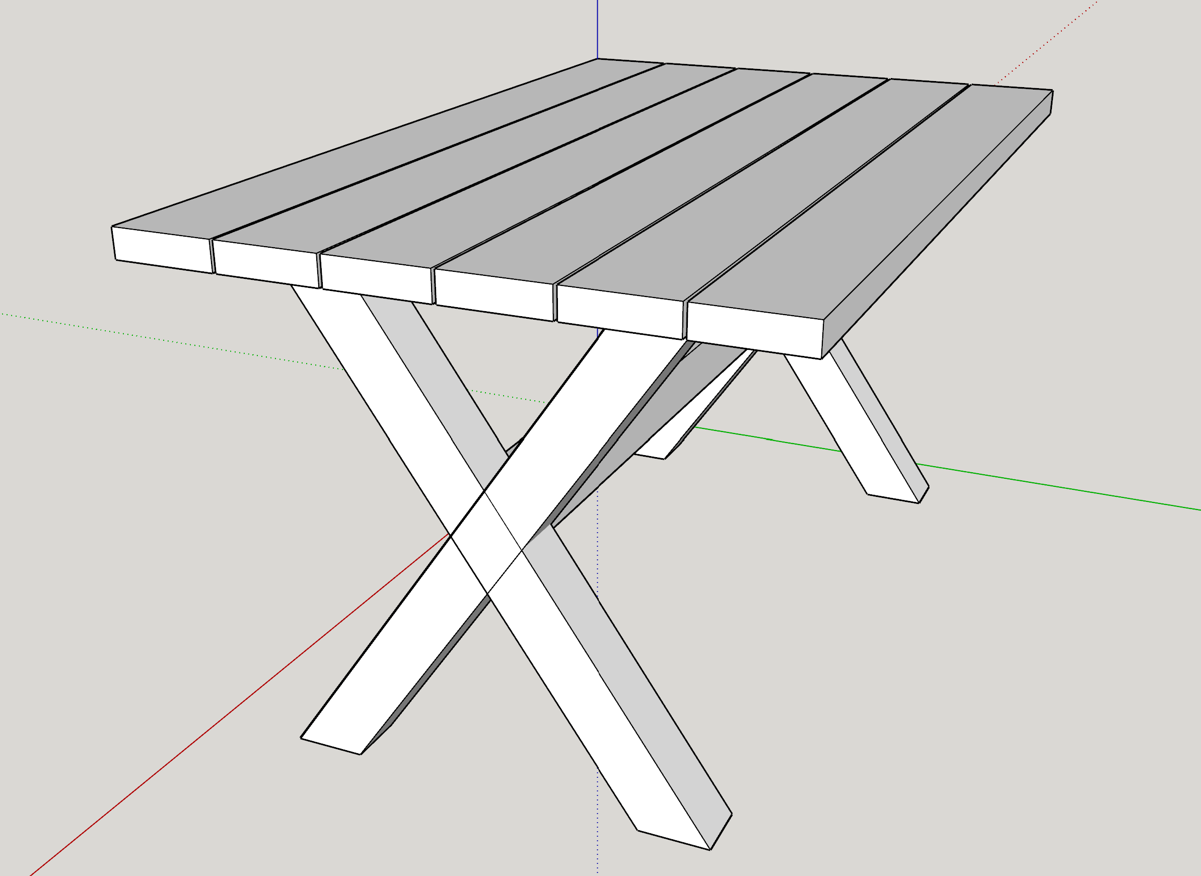 Dies war mein grober erster Entwurf für diesen Gartentisch aus Lärche – wie immer mit Sketchup erstellt. Skizzen auf Papier taugen nur bedingt, denn Anpassungen sind schwierig und Konstruktionsfehler lassen sich so nicht rechtzeitig erkennen. Mit etwas Übung kann das jedoch jeder.