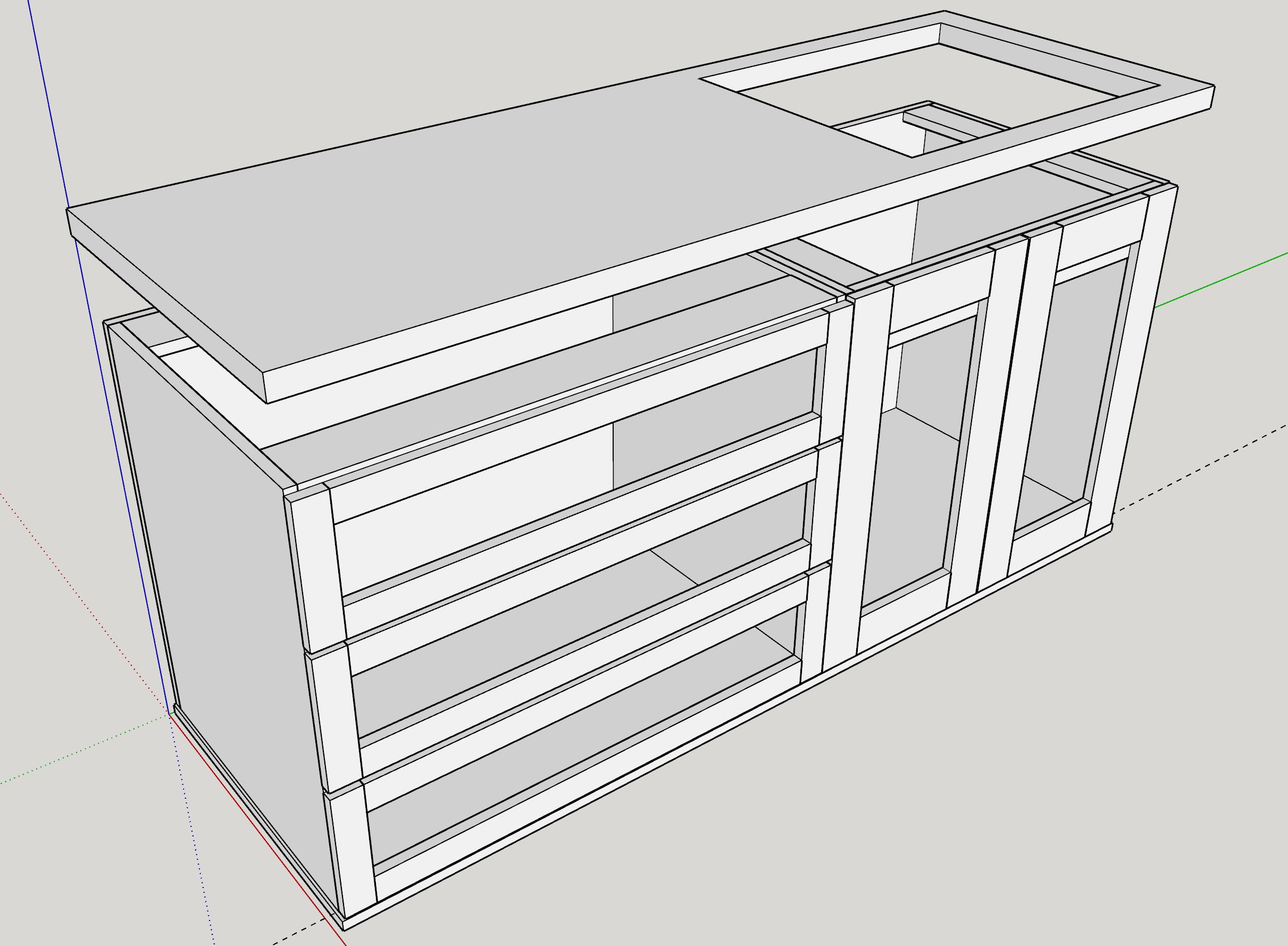 Nachdem die Überdachung für den BBQ-Platz fertiggestellt war, fehlte nur noch eins: Eine Lösung zum Kochen und zum Verstauen des gesamten Grillzubehörs. Kurzerhand habe ich einen neuen Schrank in SketchUp konstruiert.