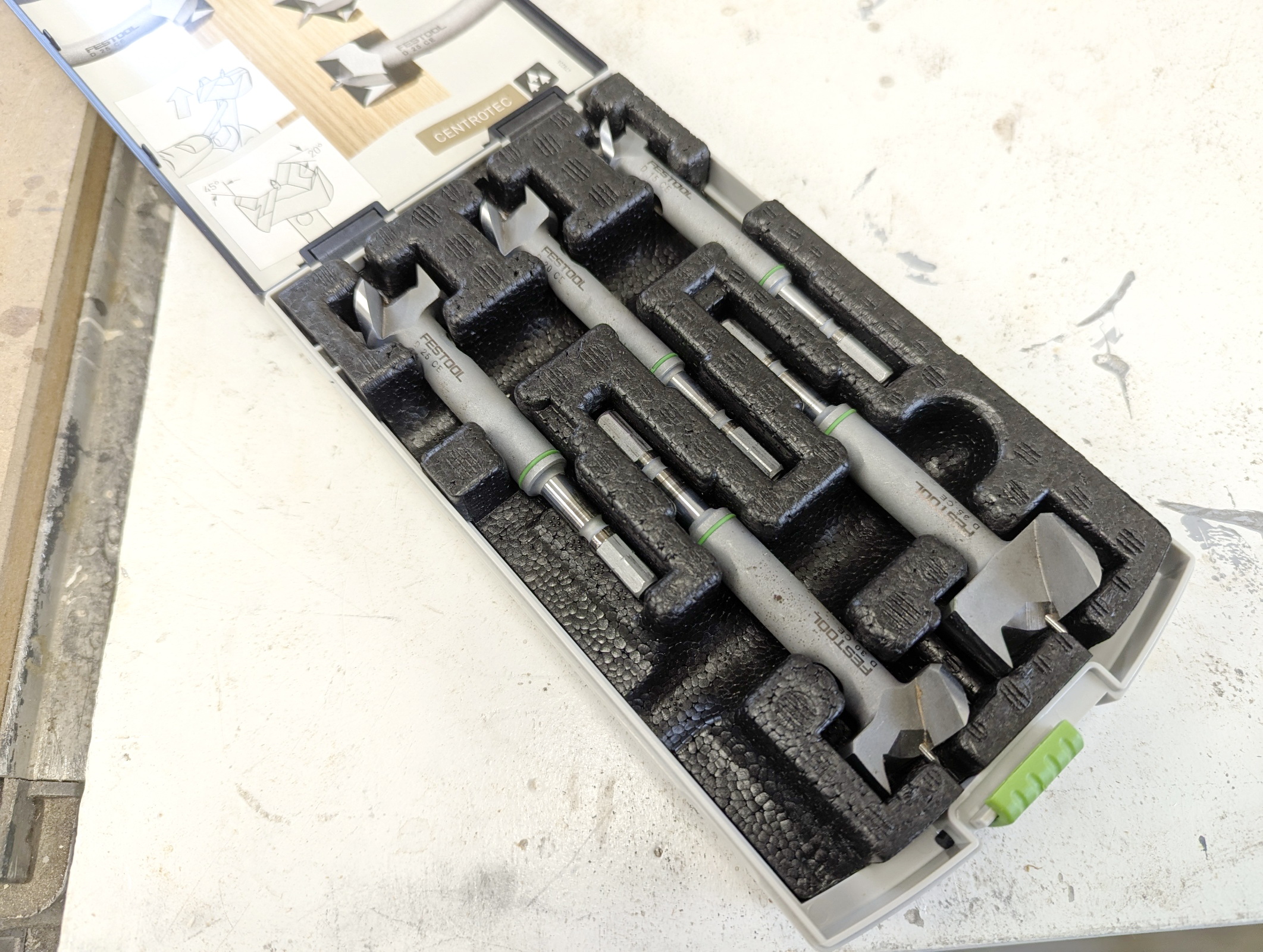 Vor einigen Jahren hatte ich mir den Forstnerbohrersatz von Festool gekauft. Vorher musste ich billige Bohrer nach kurzem Gebrauch wegwerfen. Dieser Satz allerdings ist wirklich gut und die Bohrer können immer wieder verlustfrei geschärft werden.
