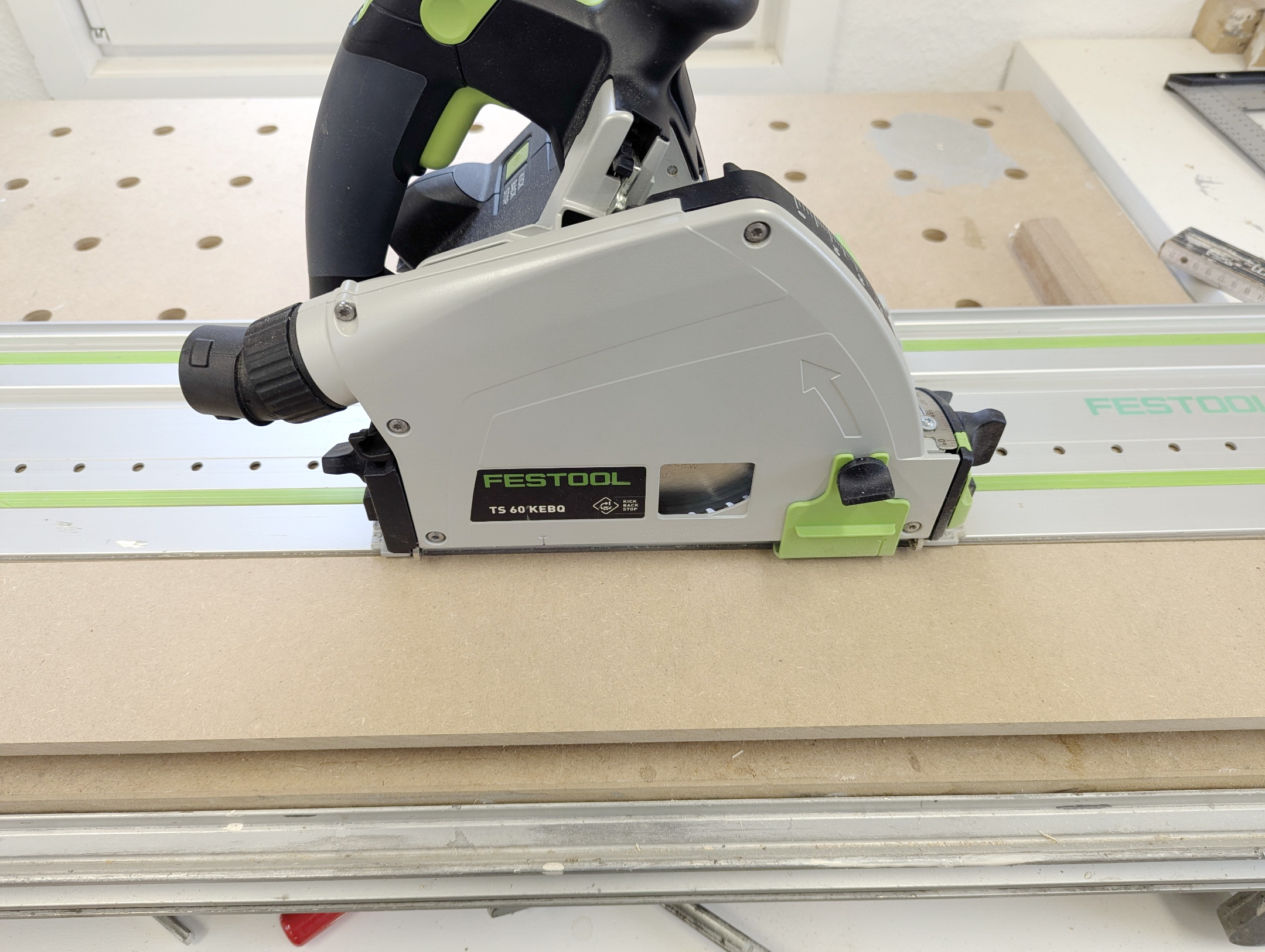 Mit der Tauchsäge habe ich das zu breite Stück MDF aufgetrennt und anschließend auf der Kappsäge abgelängt.