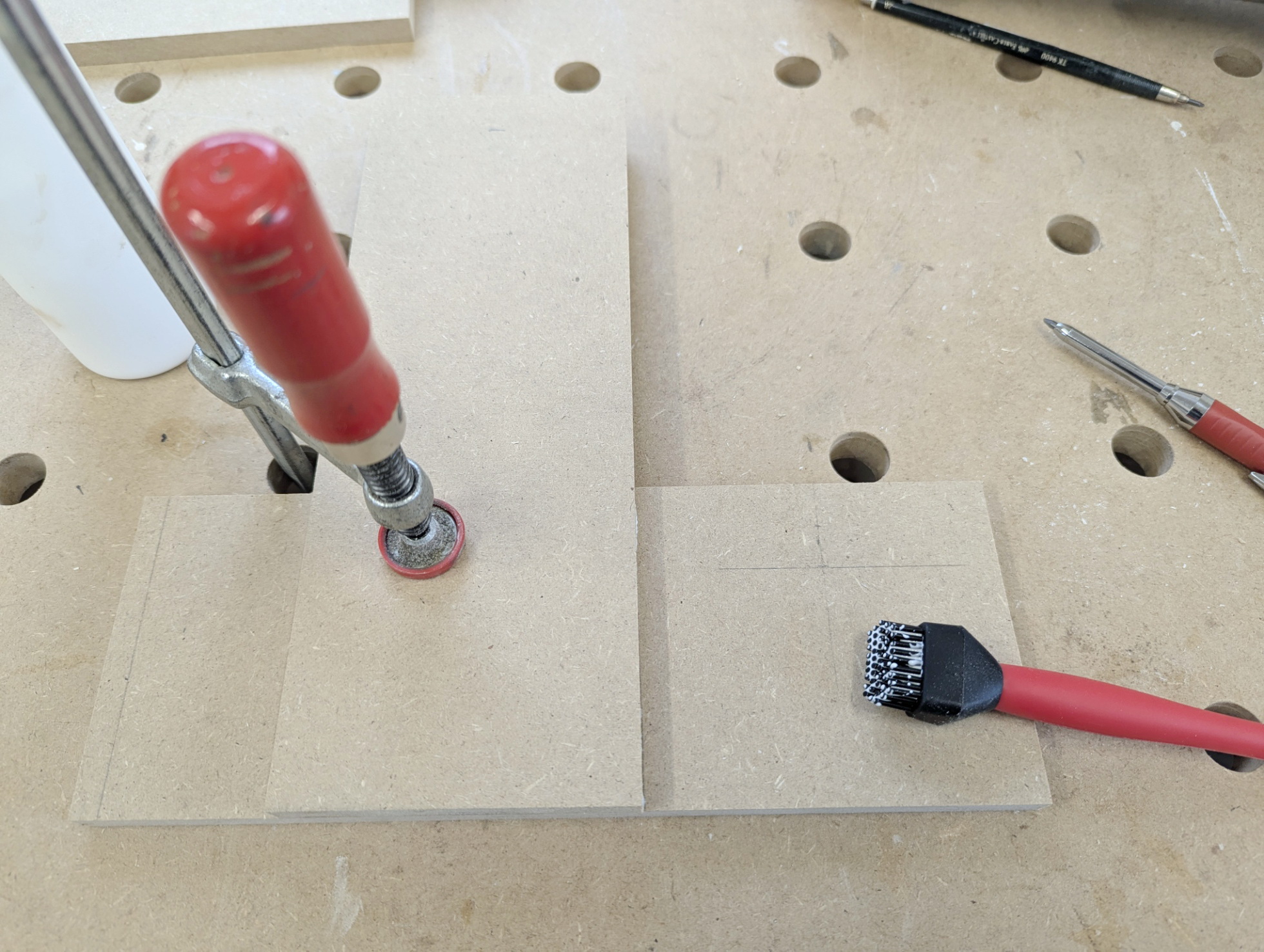 Die nötigen Bohrungen habe ich bereits vor dem Verleimen angezeichnet. Hier habe ich zum ersten Mal den neuen Leimpinsel im Einsatz. Für Euro 1,12 !! bei Temu. Lässt sich immer reinigen. Auch ausgehärtet.