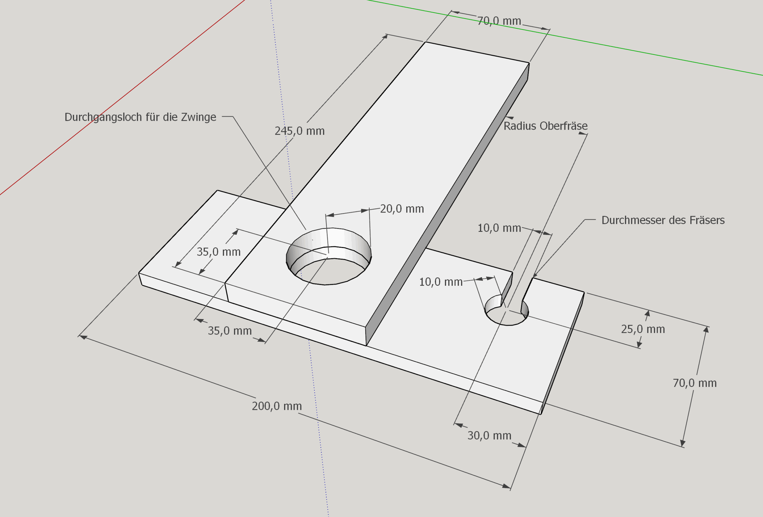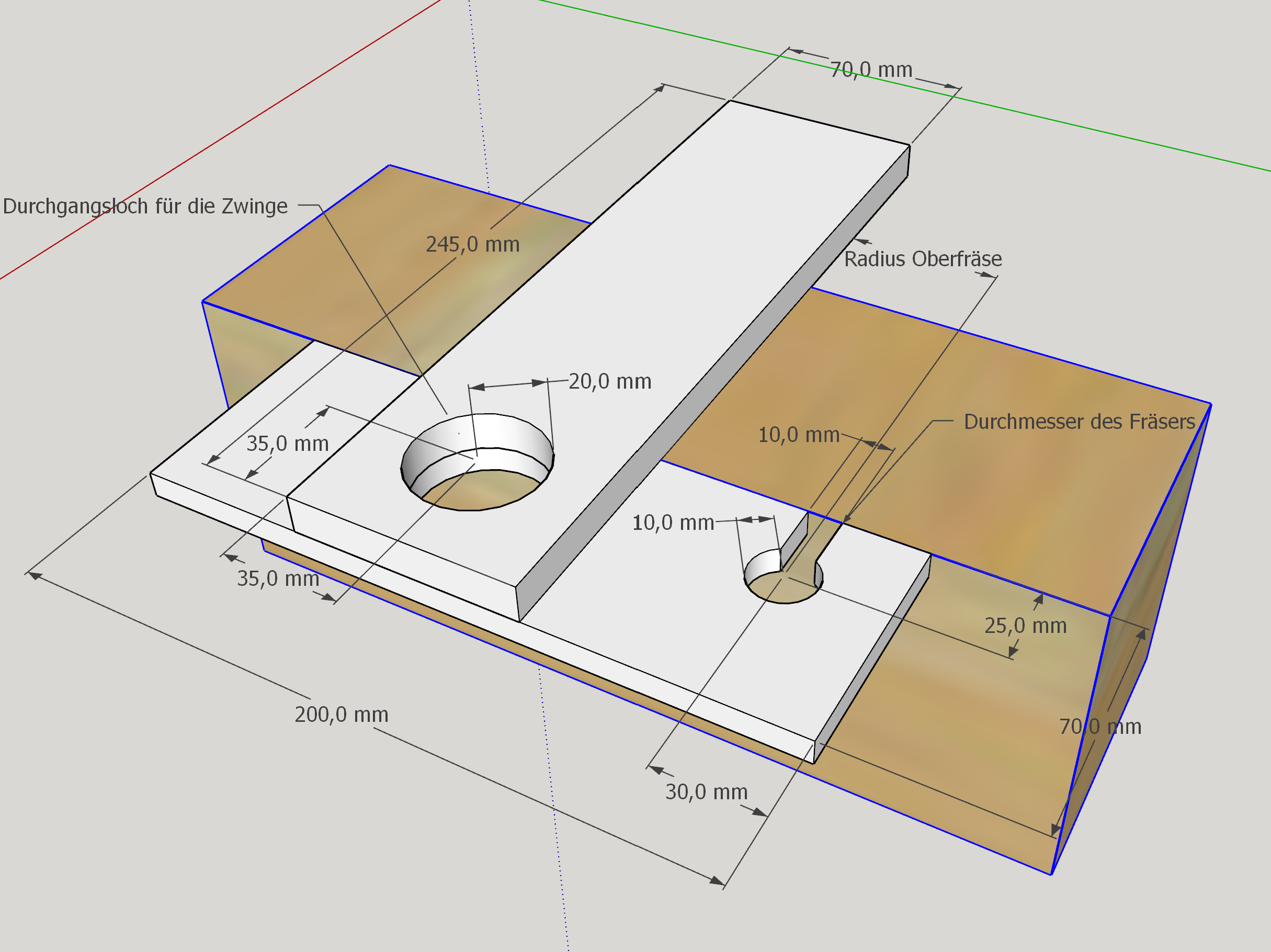Da die Öffnung nach vorn gleich mit der Oberfräse und dem gewünschten Fräserdurchmesser gefräst wird, ergibt sich das Maß für die Breite von selbst.