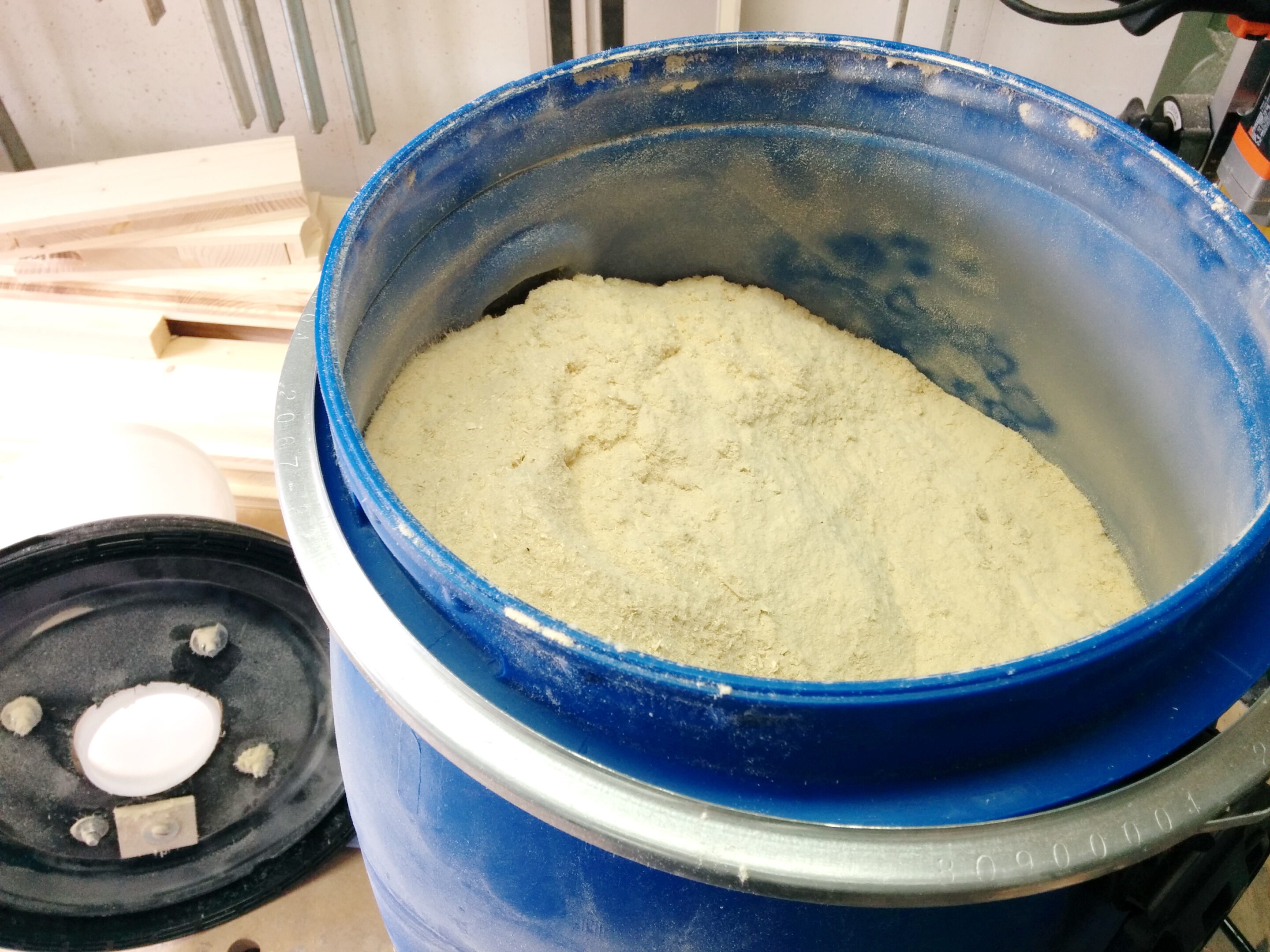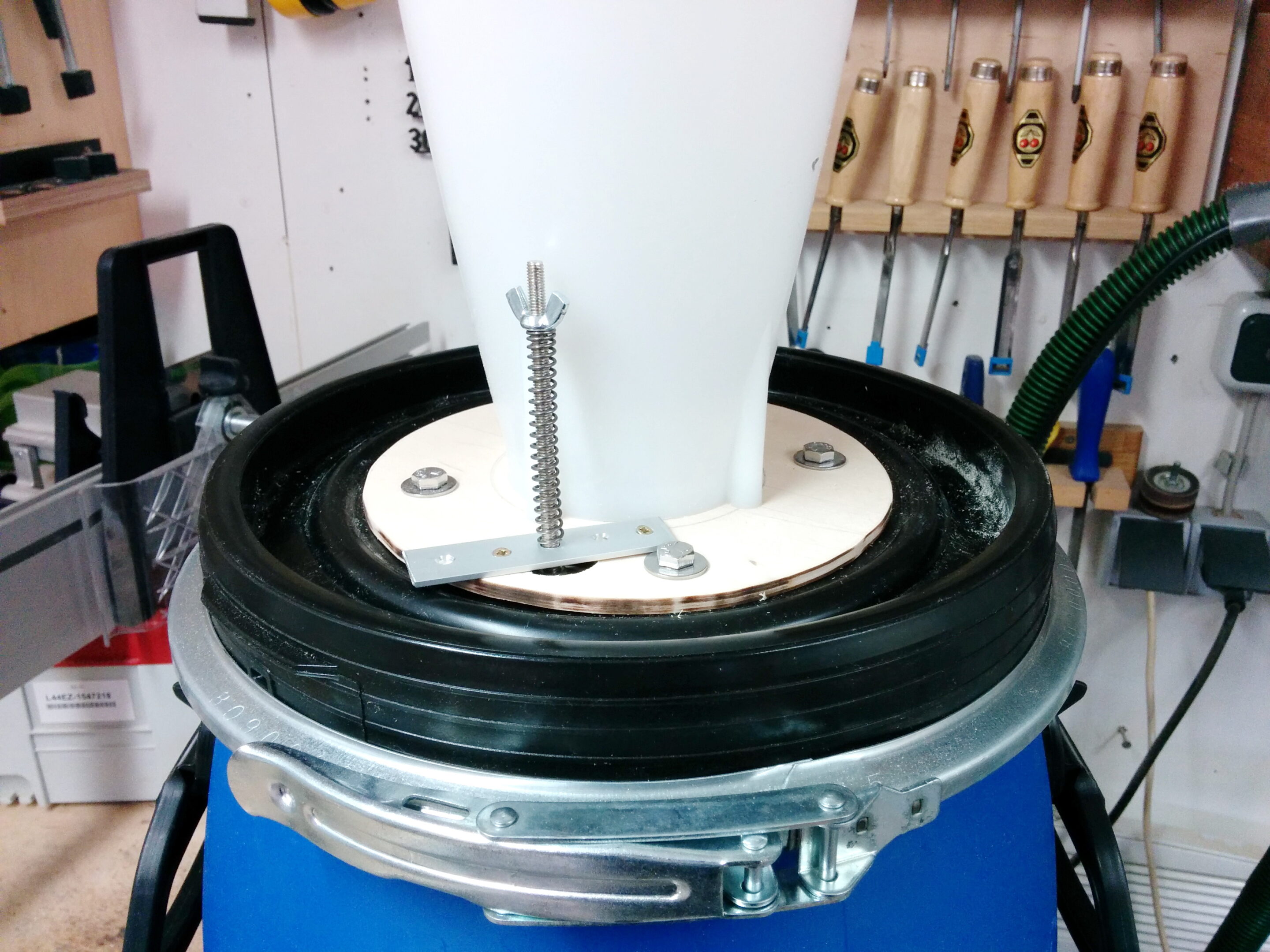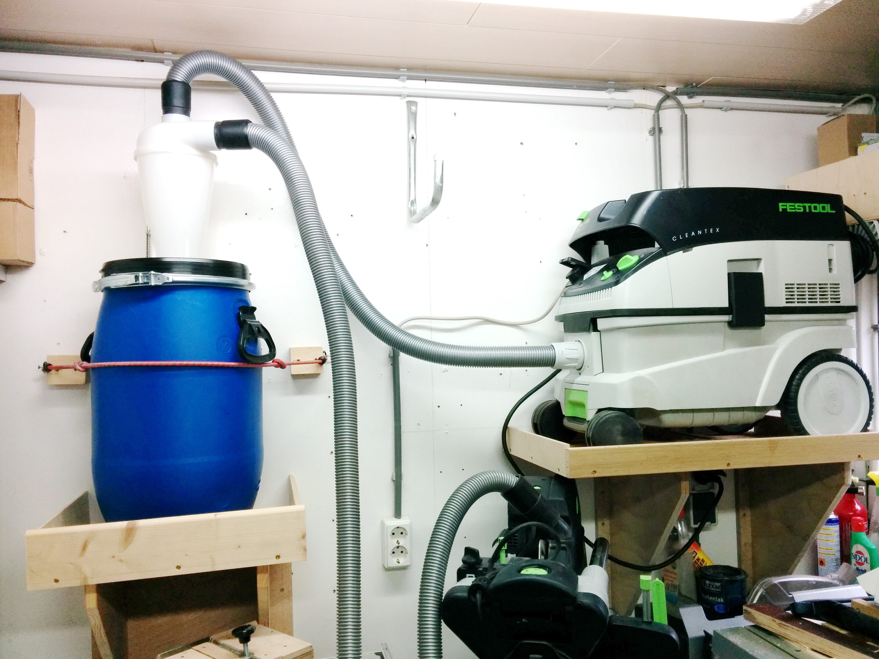 Zyklonabscheider bekommt man inzwischen für wenige Euro im Netz. Ich hatte mich damals für ein Kunststoff-Spundfass entschieden – ein großer Fehler. Diese Fässer halten dem starken Unterdruck nicht stand und implodieren bei hoher Saugleistung.