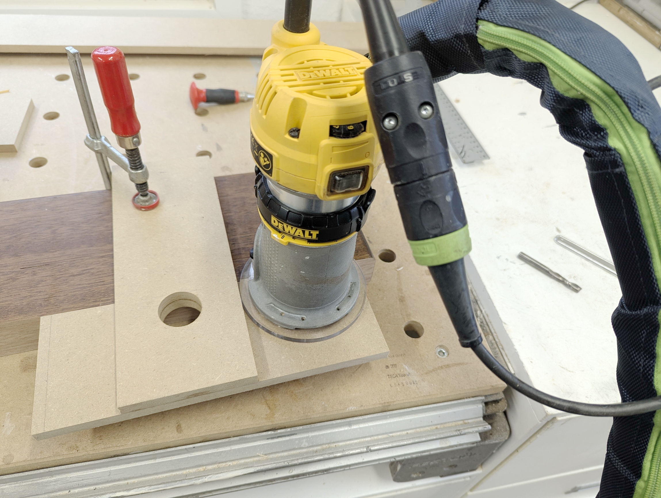 Hier beschreibe ich den Schablonenbau für die DEWALT D26204K. Für den Schablonenbau habe ich die eckige Fräsplatte gegen die runde Platte mit einem Durchmesser von 115 mm getauscht. Offenbar ist diese Zusatzplatte aktuell nicht mehr im Lieferumfang enthalten.