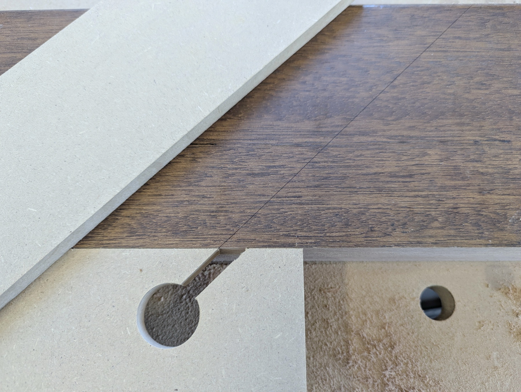 Um eine ein wirklich passende 45 Grad-Nut ins Holz zu fräsen, wird die Schablone mit einem der Ränder des Weges vom Fräser genau an die gezeichnete Linie ausgerichtet. So kann man sicher sein, das der Fräser genau an der Linie vorbeifährt. Ein Ausklinken für eine Holzverbindung ist somit schnell erledigt.