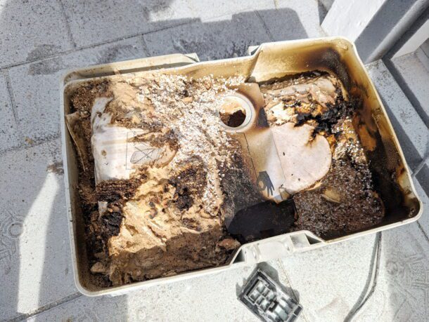 Man kann gut die Mitte vom Bohren am Boden erkennen. Genau dort habe ich auch die Spitze des 19mm-Bohrers angesetzt und über eine Unterlage durchgebohrt,