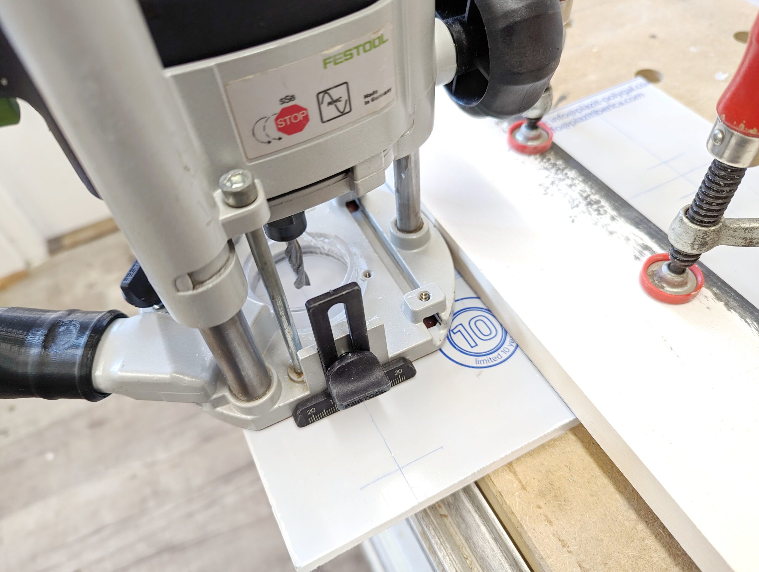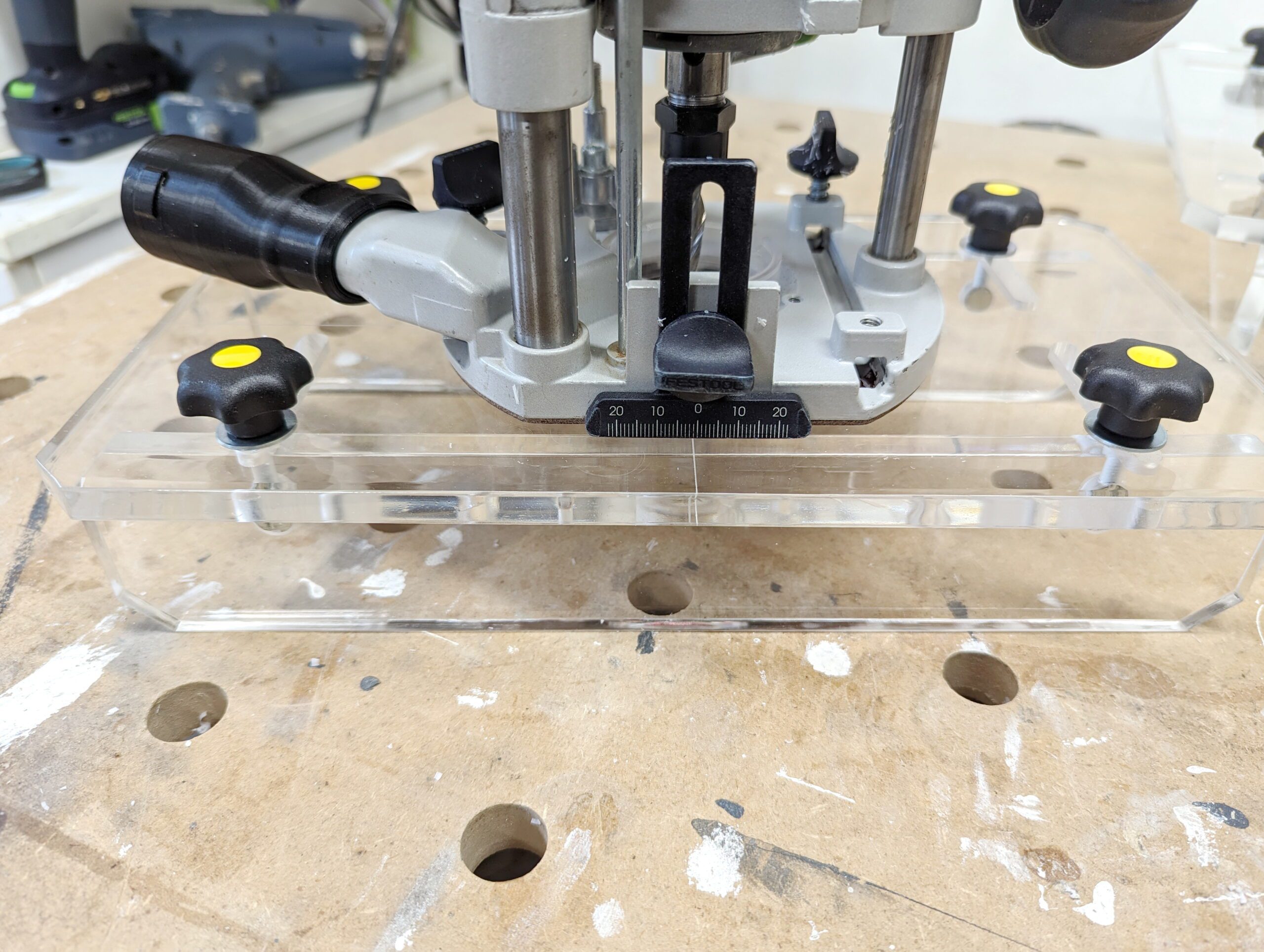 Die bei Festool angebotene Fräshilfe verfügt über eine Absaugungsmöglichkeit auf der Platte. Macht das Sinn? Wieviel Schläuche kann man denn anschließen? Nein – diese Funktion lasse ich weg.
