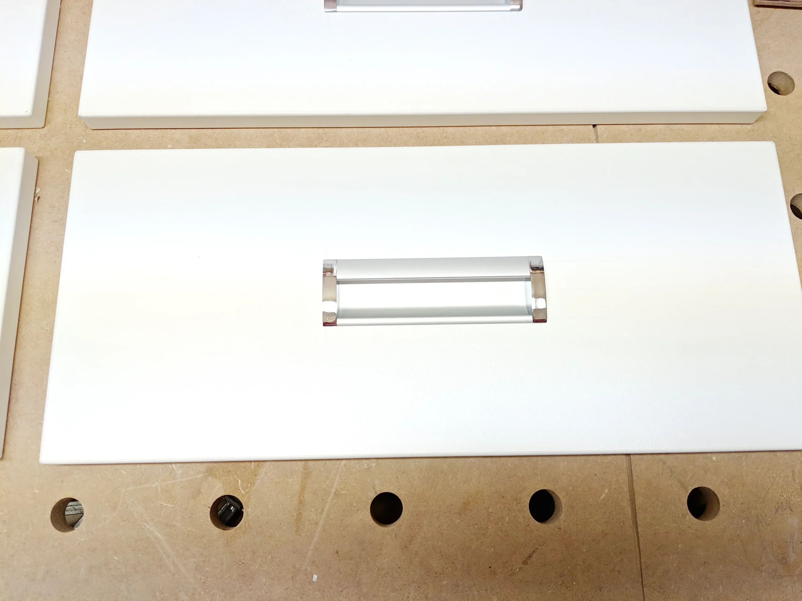 Die Schubladen werden mit Einlassgriffen versehen.