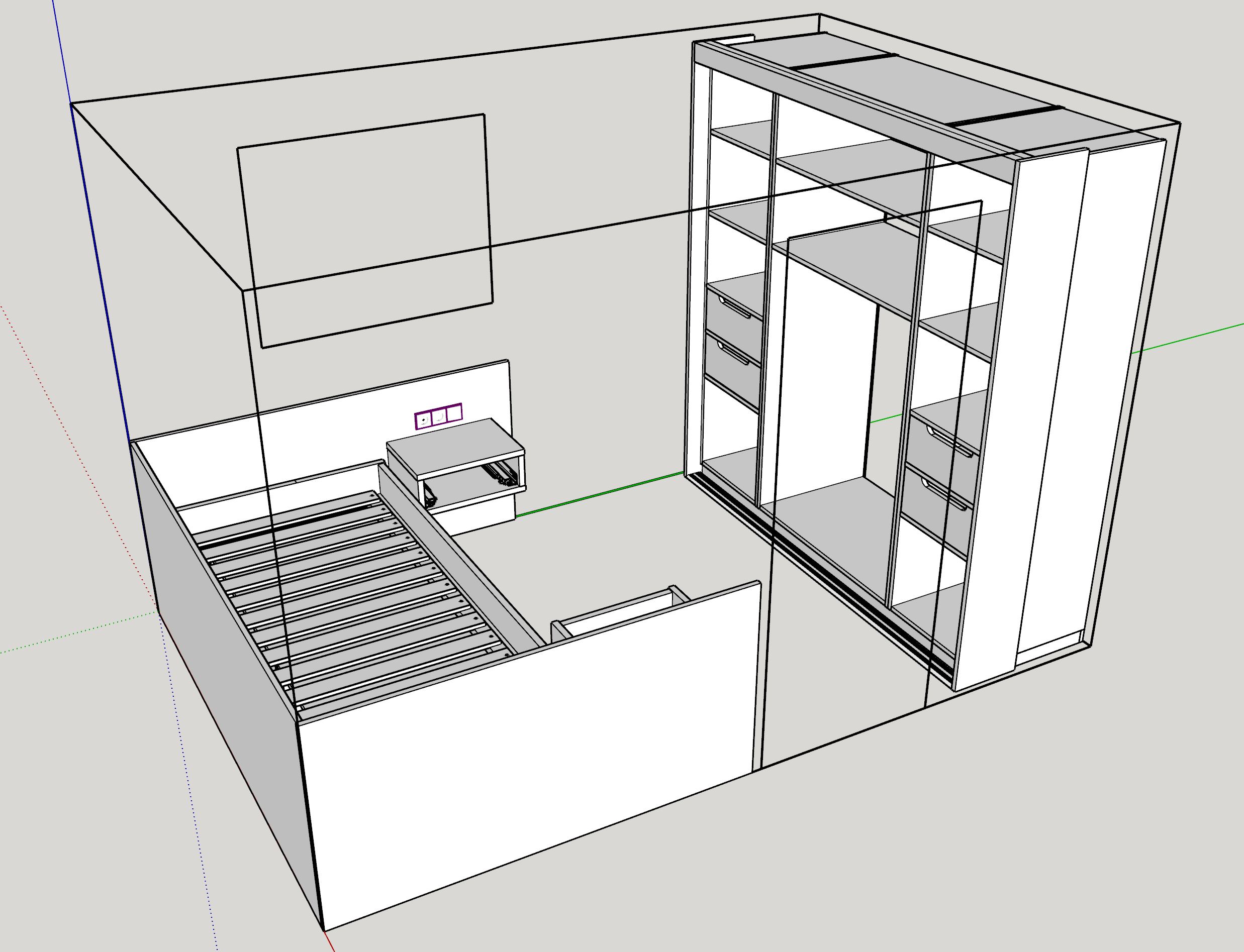 Der Kleiderschrank soll genau in diese Wandecke hineinpassen. Er soll 4 Schubladen haben und 2 Schiebetüren. Die Auszüge sind Selbsteinzüge und die Türen sind von Häfele-Beschlägen gehalten.