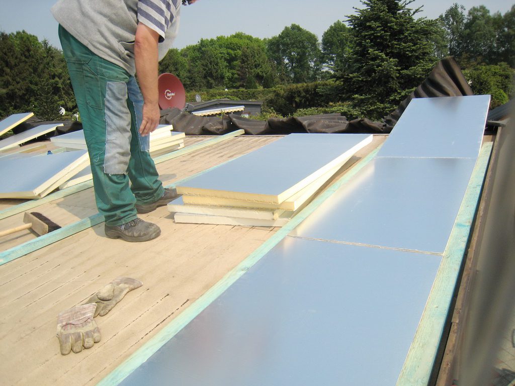 Da die Spanplatten noch in gutem Zustand waren, konnten wir sofort mit der Arbeit beginnen. Zuerst haben wir die 40×40 mm-Latten in Längsrichtung angebracht, dazwischen die PIR-Dämmplatten eingelegt und anschließend die Querlattung montiert. Unter den Blechdachziegeln muss schließlich eine Luftschicht bleiben.