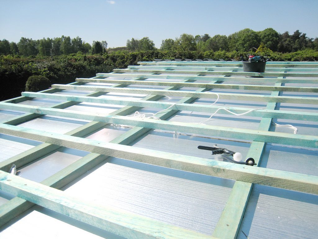 Unter die Blechpfannen sollte gemäß Vorschrift eine PIR-Dämmung gelegt werden. Also habe ich Dachlatten in 40×60 mm und die Dämmung besorgt. Das alte Wellpappdach wurde entsorgt, sodass nur noch die Spanplatten als Untergrund übrig blieben.