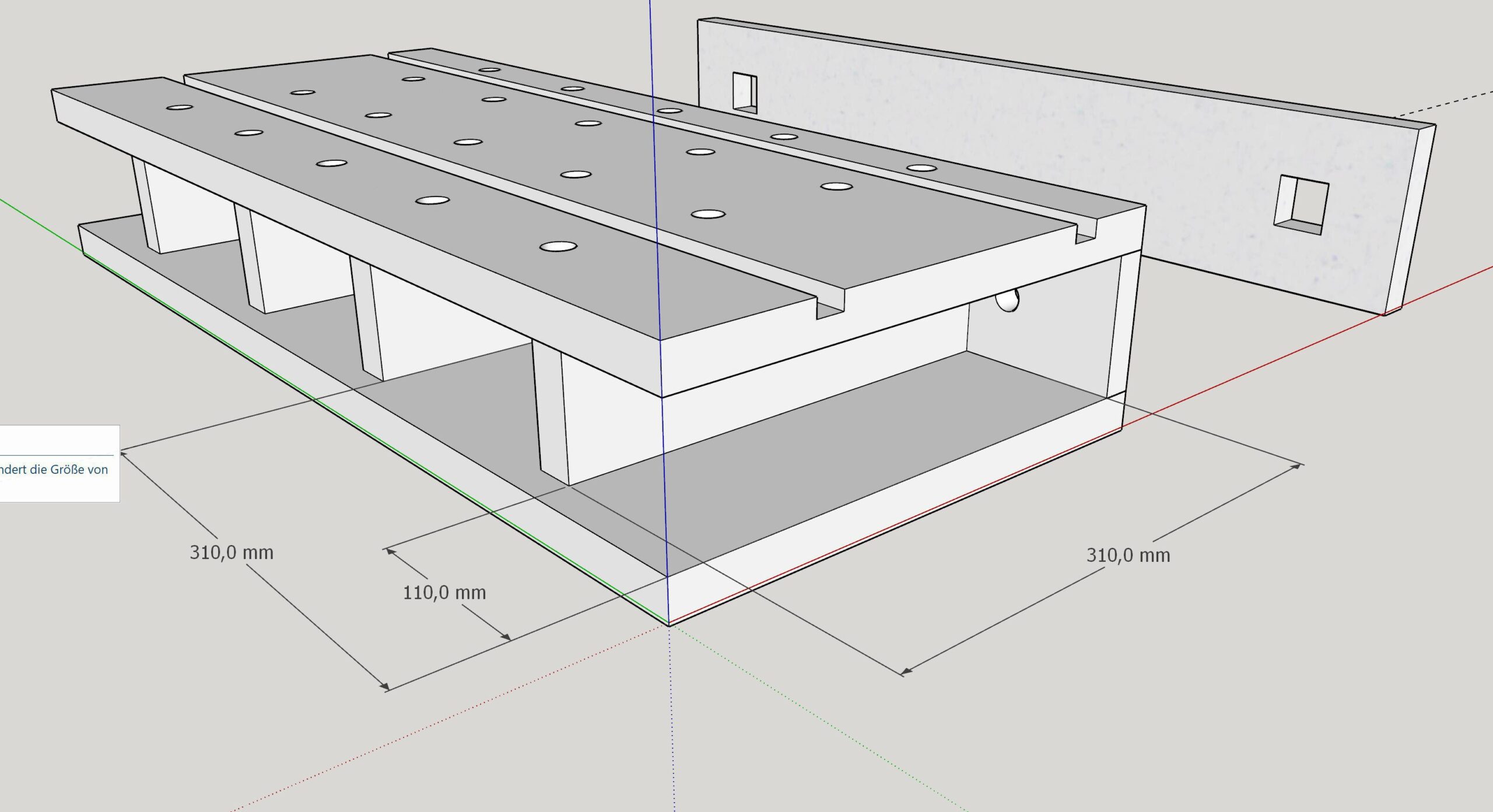 Natürlich darf ich den Bauplan der Zeitschrift hier nicht veröffentlichen. Ich habe die Aufsatzbank daher für mich selbst in SketchUp nachkonstruiert, um eine genaue Orientierung zu haben.