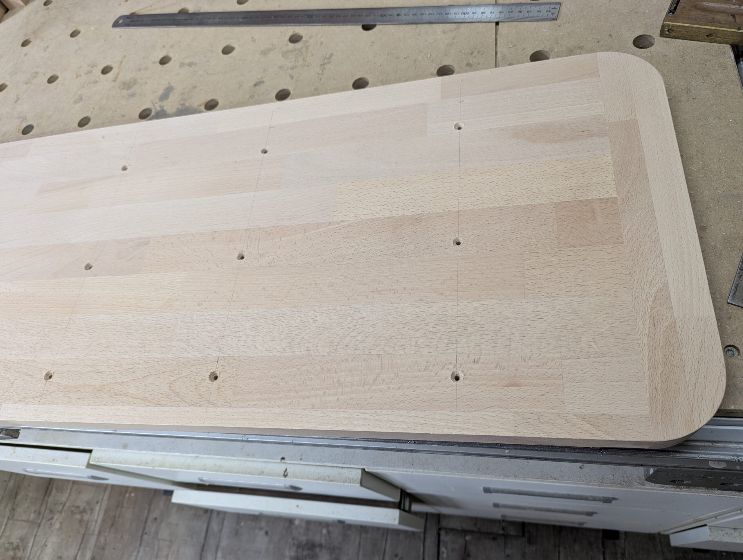 Als die Zeitschrift mit dem Bauplan erschien, sah die Marktsituation im Holzbereich noch deutlich anders aus. Heute ist es nicht einfach, Buchenleimholz mit durchgehenden Lamellen zu finden. Daher entschied ich mich für keilgezinktes Buchenleimholz – deutlich günstiger als Eichenleimholz. Beide Holzarten gehören zudem zur selben Familie, sodass die Stabilität und Optik vergleichbar sind.