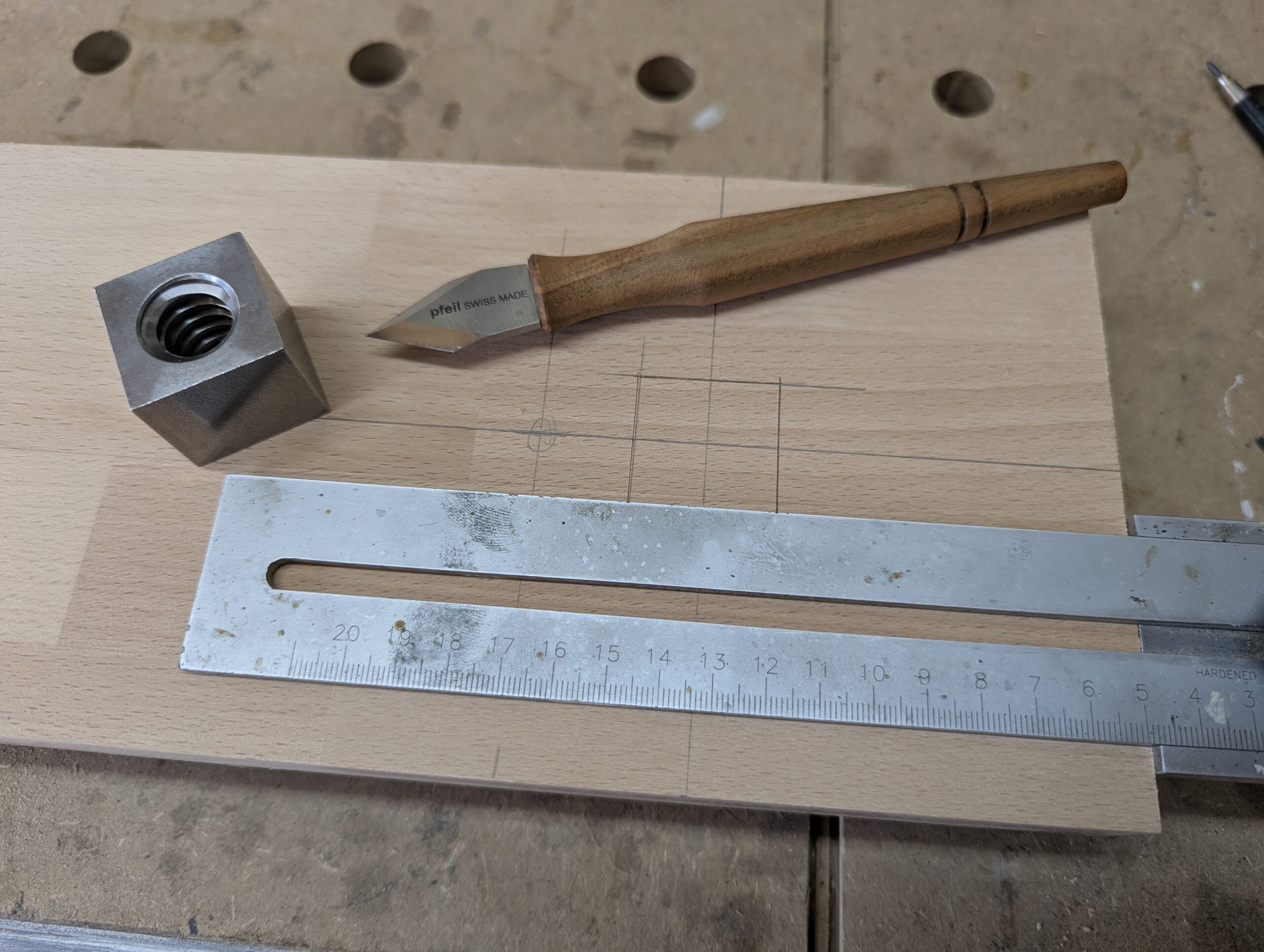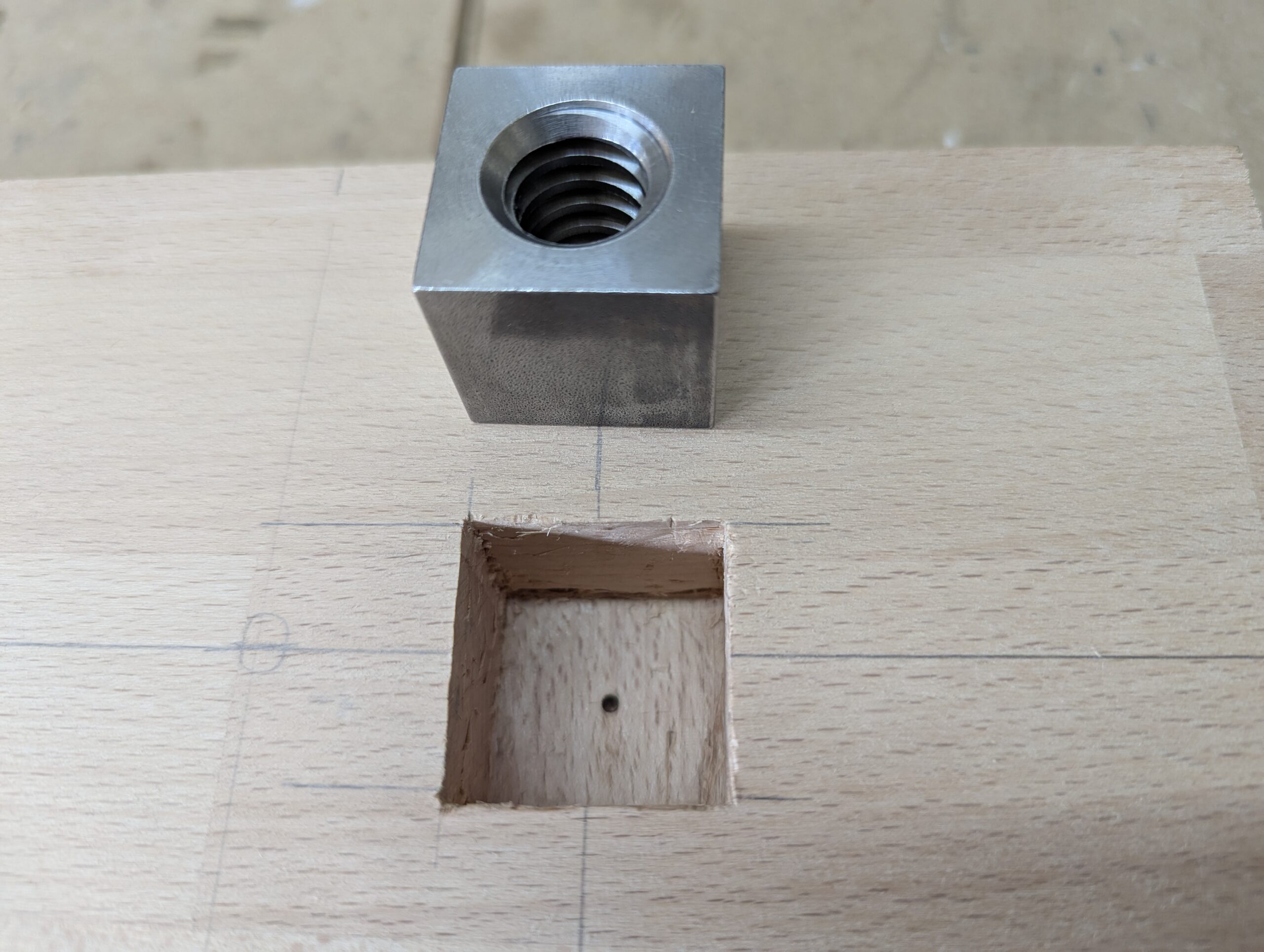 Die Zange erhält eine Doppelung an den Enden um die Gewindestange sicher zu befestigen. Anders als Heiko Rech habe ich es über eine Verschraubung vorher gelöst. Ich bohre und stemme vor dem Anbau der Innenzange. So ist das viel einfacher. Außerdem verwende ich hier Vierkantmuttern. Der Mittelpunkt der Bohrung ist vorgegeben und der Umriss der Vierkantmutter mit Bleistift übertragen. Kanten mit dem Meser nachgezogen.
