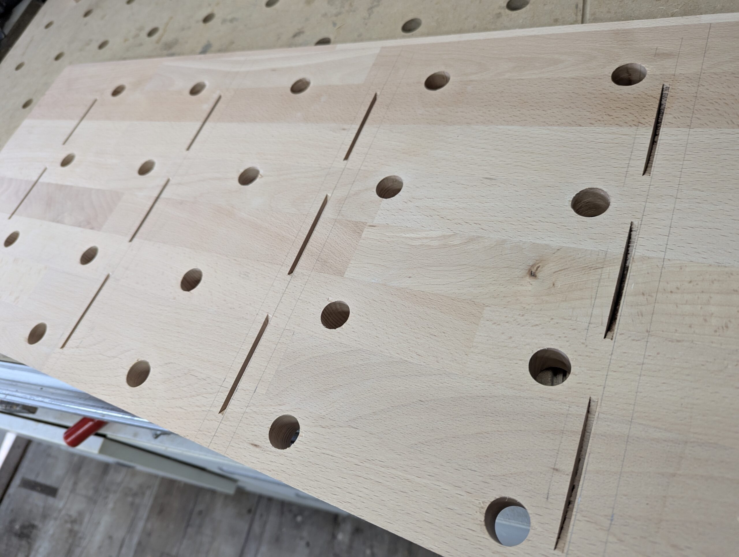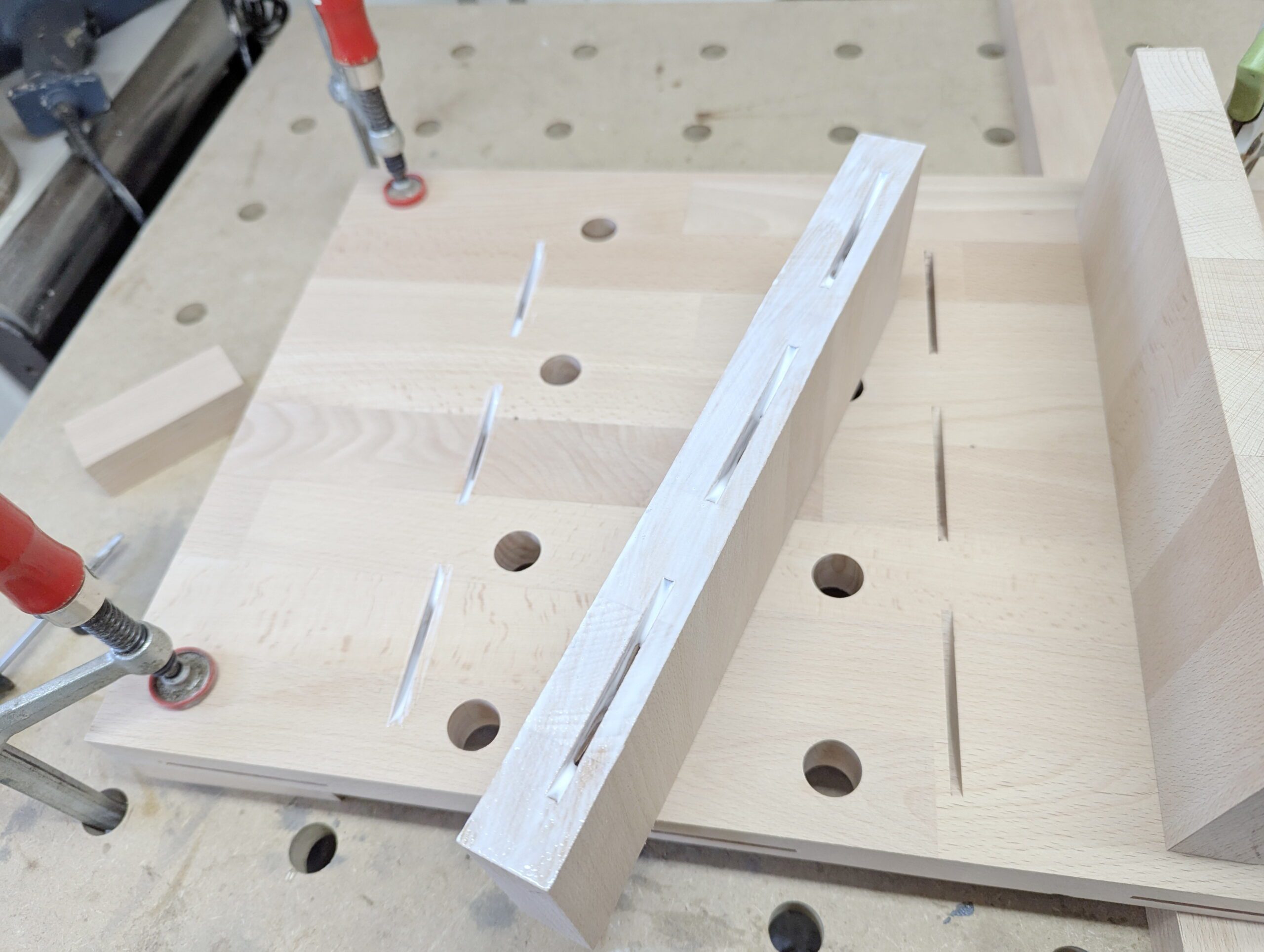 Da ich das Holz erst am nächsten Tag verarbeiten wollte, habe ich die Platten unter Zwingen gesetzt. Buchenholz neigt bekanntlich stark zum Verziehen – manchmal schon beim Hinschauen.