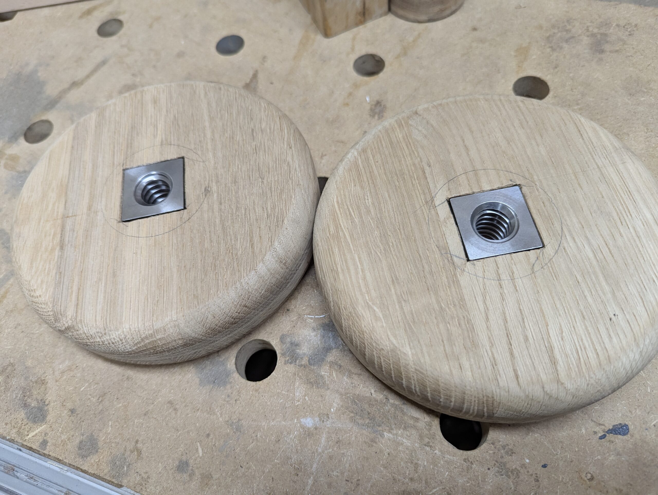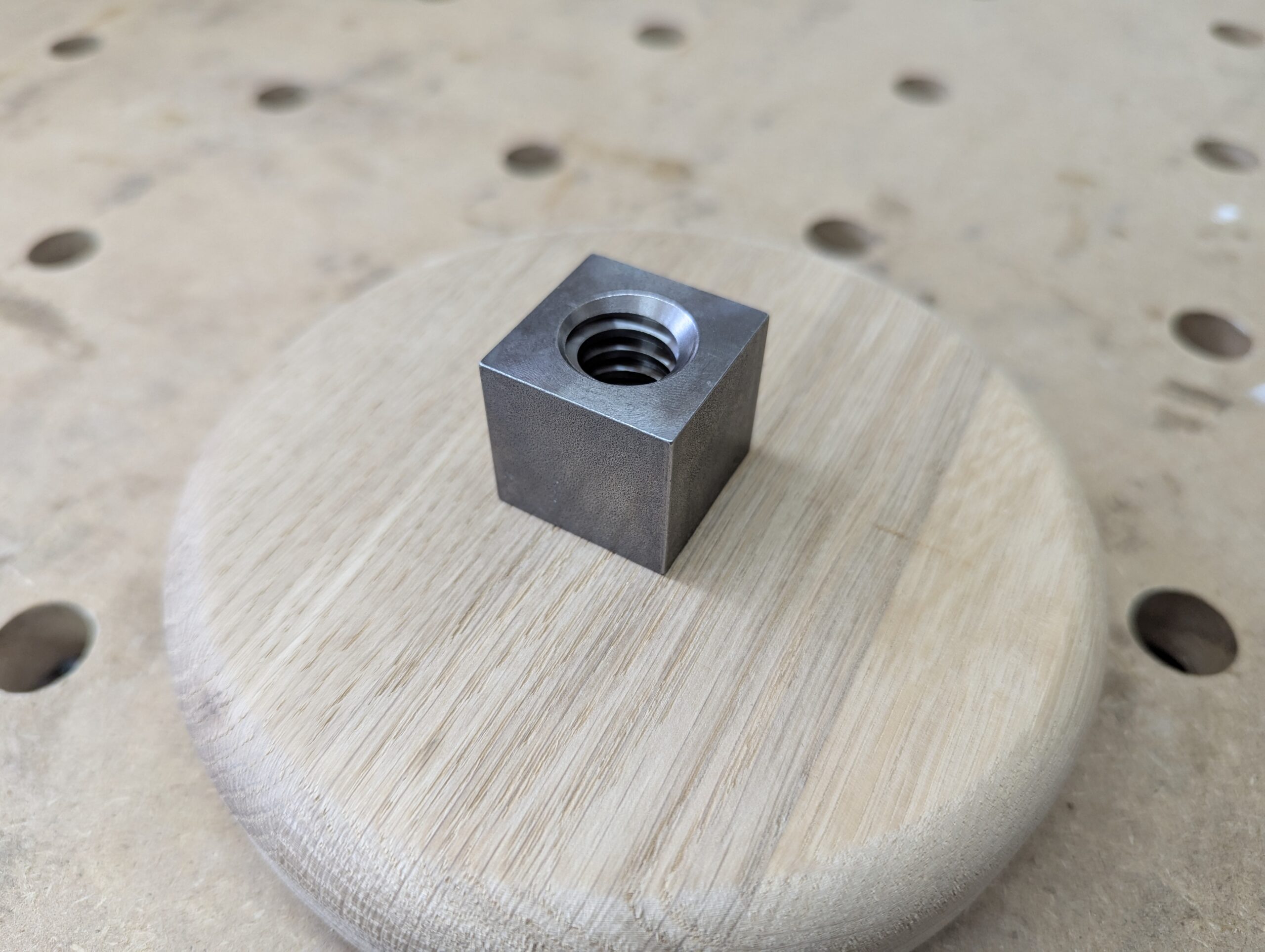Nur müssen die Muttern in die Handräder eingebaut werden. Die Vierkantmuttern sind 27mm hoch. Also muss ich stemmen.