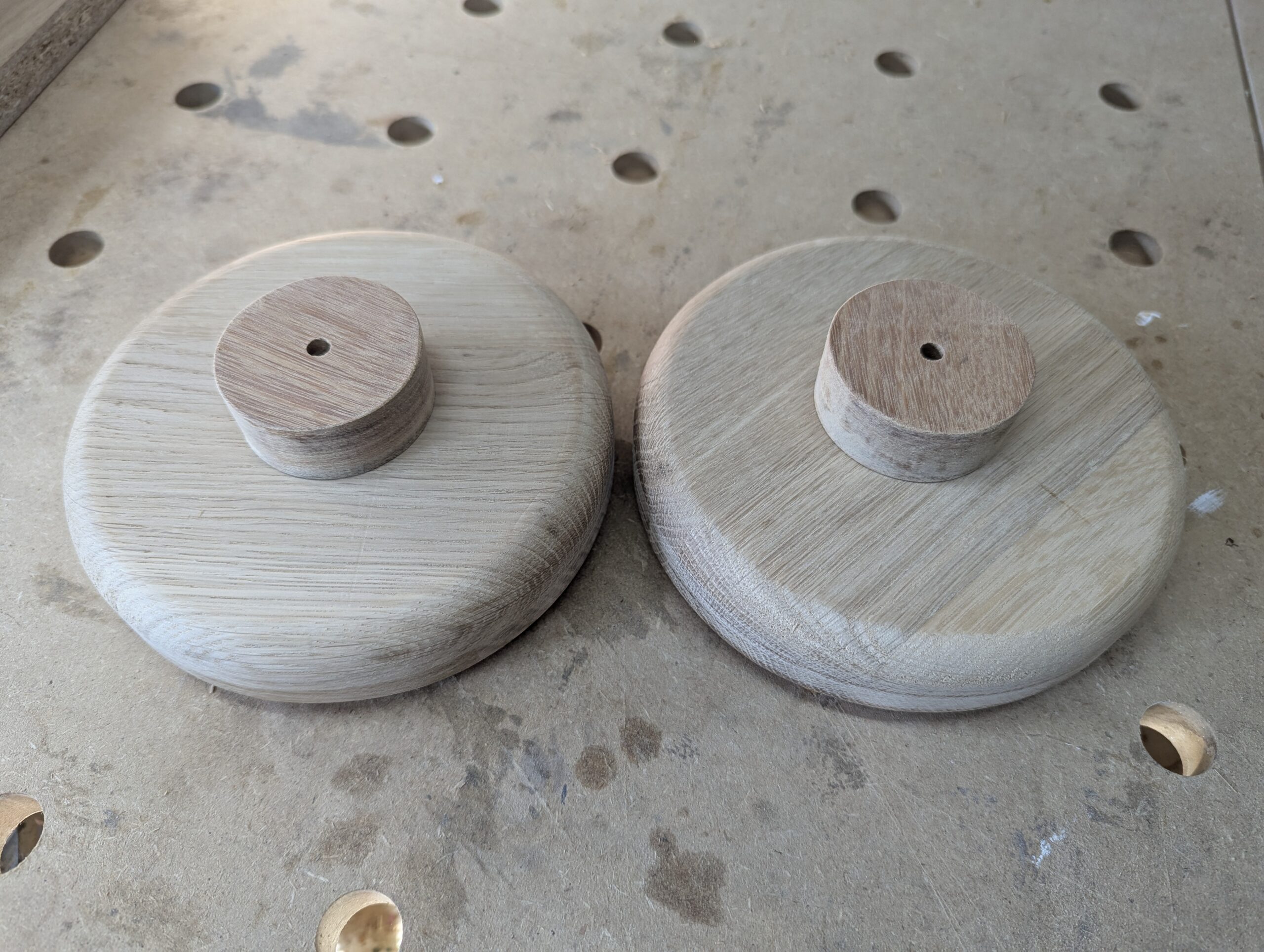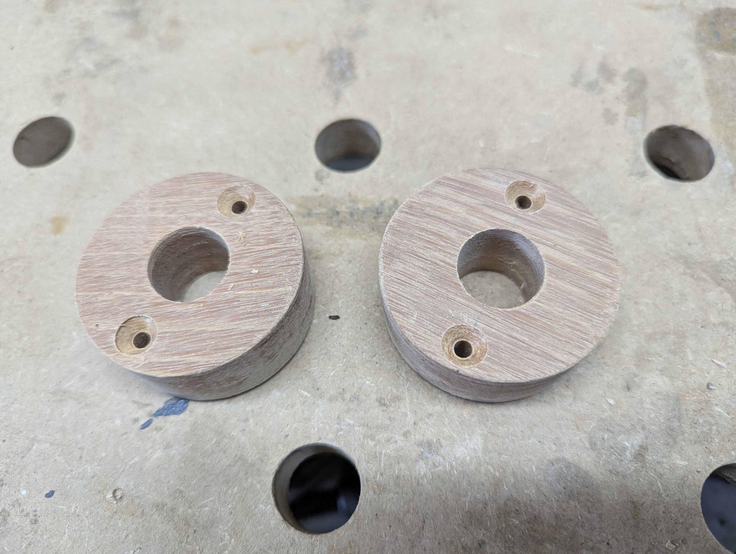 Die Handräder benötigen im angezogenen Zustand auf der Aufsetzzange einen gewissen Abstand zur Außenbacke. Diesen Abstand kann man zwar mit Unterlegscheiben erzeugen, doch die wabbeln dann einfach nur auf der Gewindestange. Die Naben habe ich mit einer entsprechend großen Lochsäge aus dem Restholz ausgebohrt.