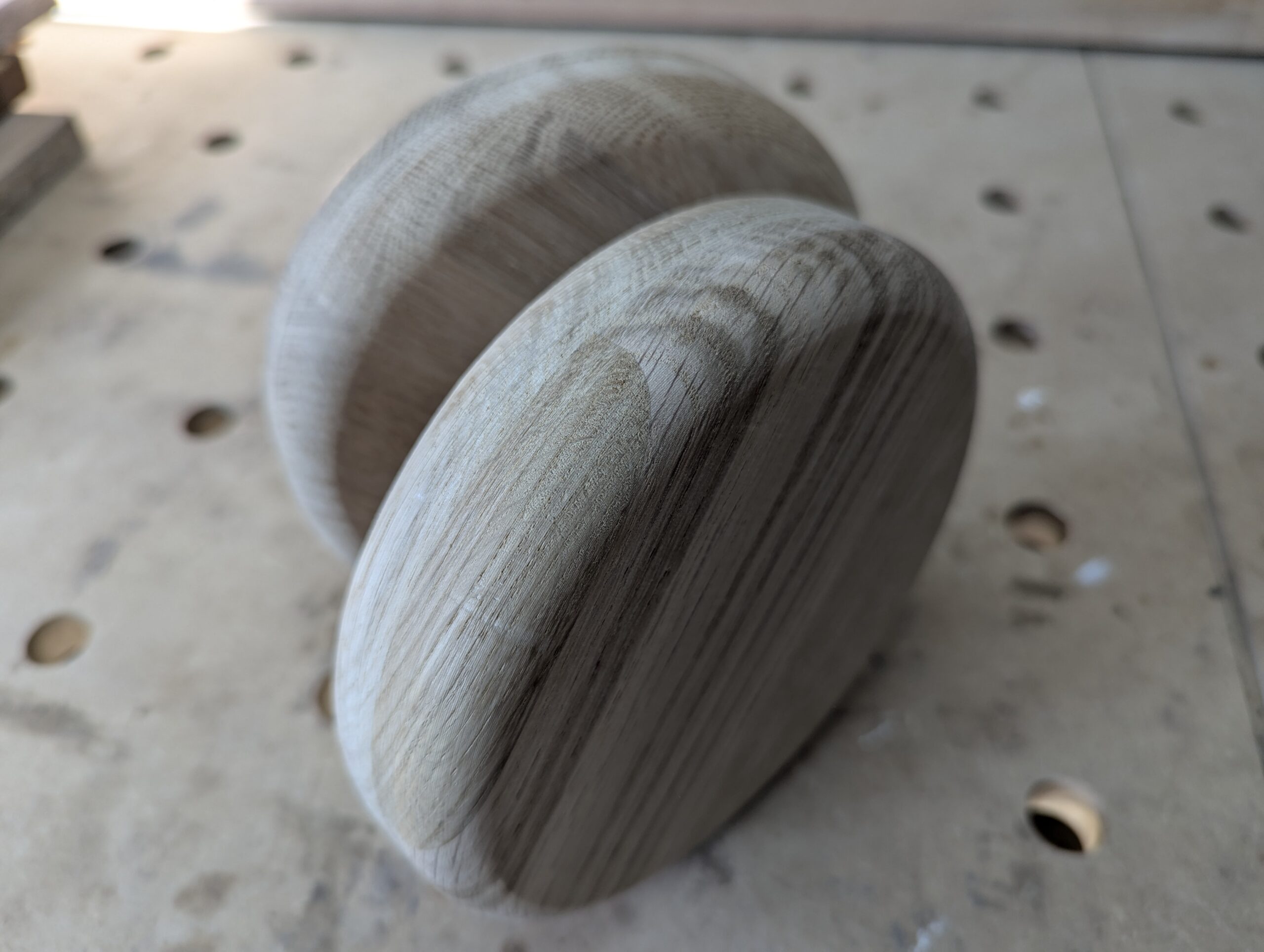Das Abrunden der Handradkanten hat sehr gut funktioniert. Keine unschönen Übergänge. Der Radius wurde vollständig auf das Holz übertragen.