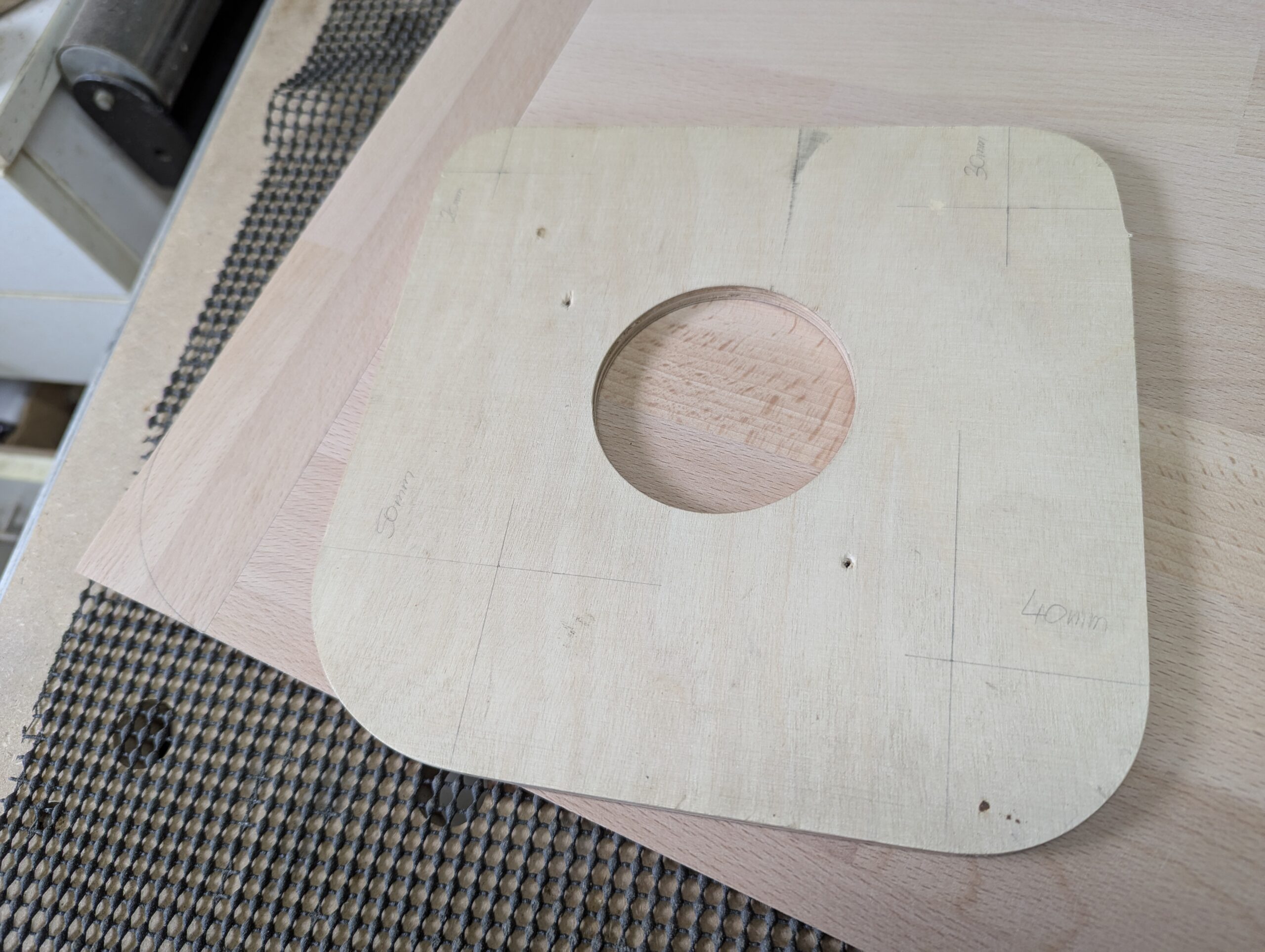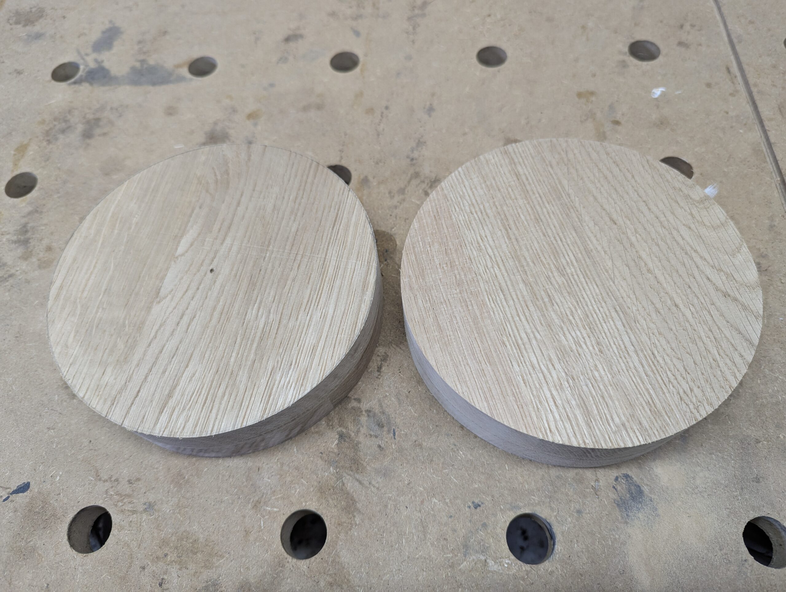 Nach Aushärtung des Leims habe ich zwei Kreise mit Durchmesser von 150mm nebeneinander angerissen und die Teile grob auf der Kappsäge ausgeschnitten.