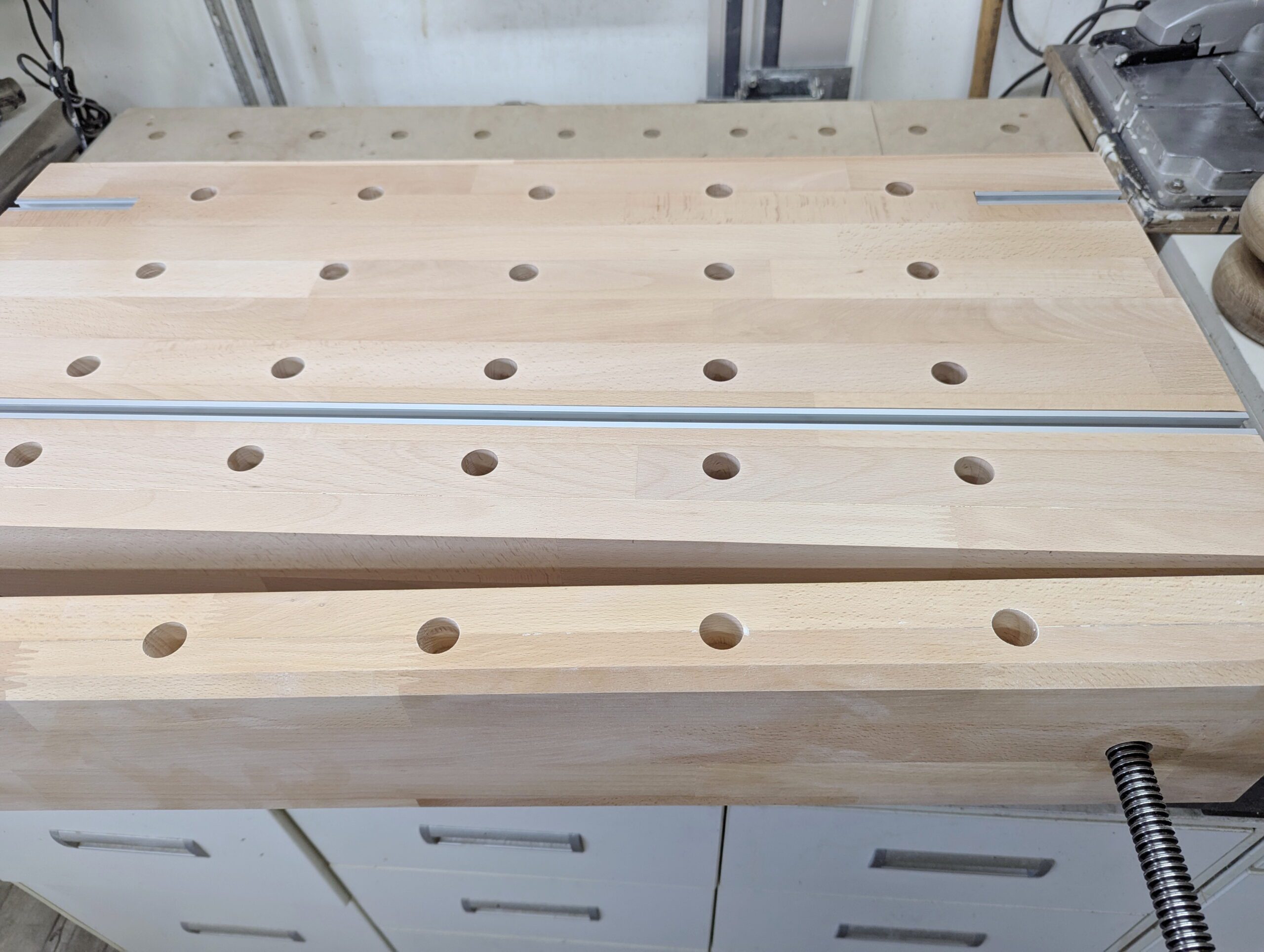 Heute, kurz vor Fertigstellung fiel mir ein, dass ich bspw. meine Tischzwingen gar nicht mit der Aufsetzbank benutzen kann. Außer in der C-Nut-Schiene. Die Tischplatte ist mit 26mm einfach zu dick um die Zwingen in die Bohrungen schieben zu können. Na ja, es ist ja eine Schiene da.