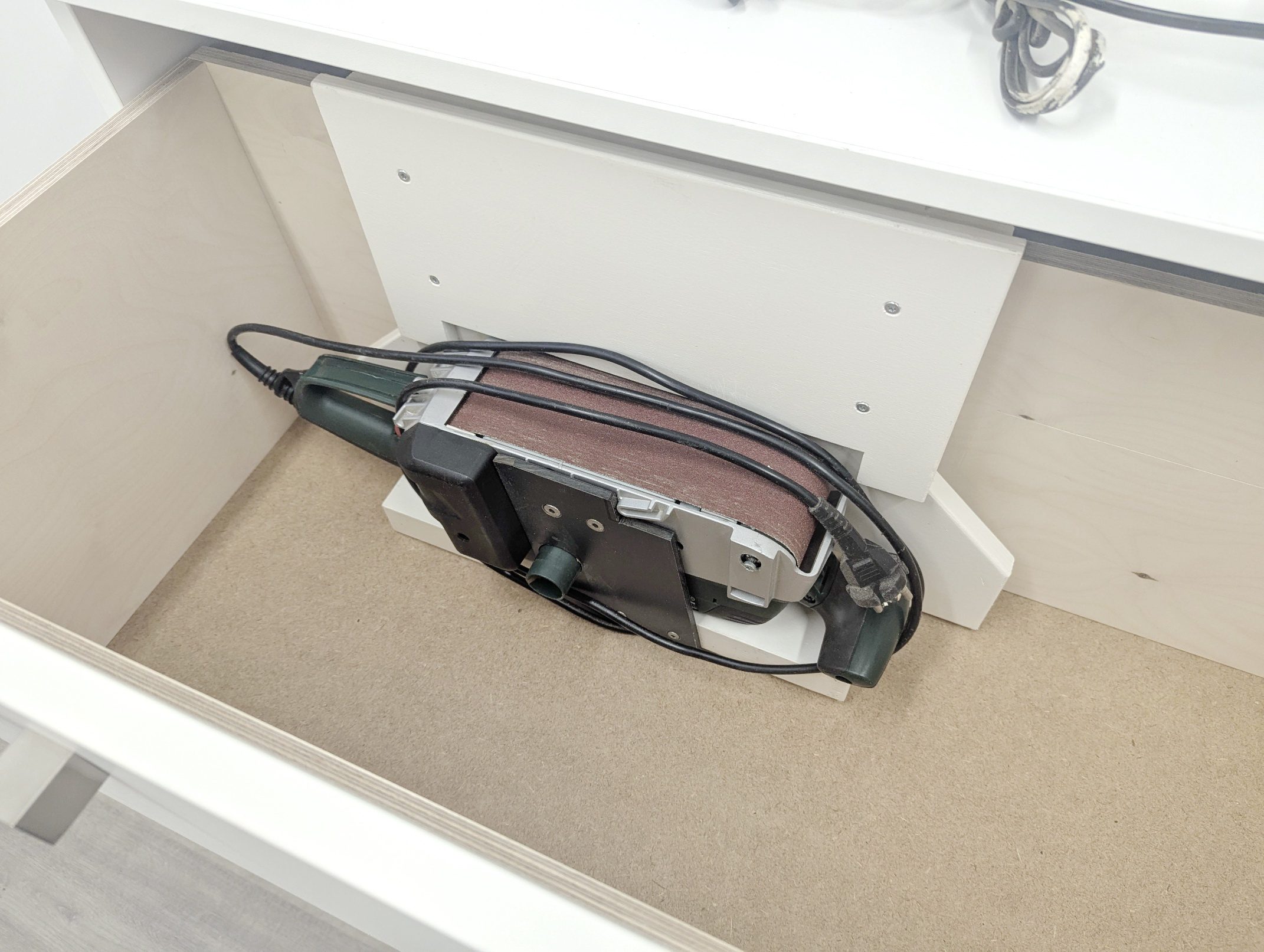 Bisher lagen Werkzeuge wie Schlagbohrer, Multifunktionswerkzeug und der Schlüsselkasten noch im Nebenschrank der Werkbank. Bedeutet: Wenn ich den Schlagbohrer brauchte, musste ich erst den Schlüsselkasten herausnehmen, um an den Maschinenkoffer zu gelangen – ziemlich lästig.