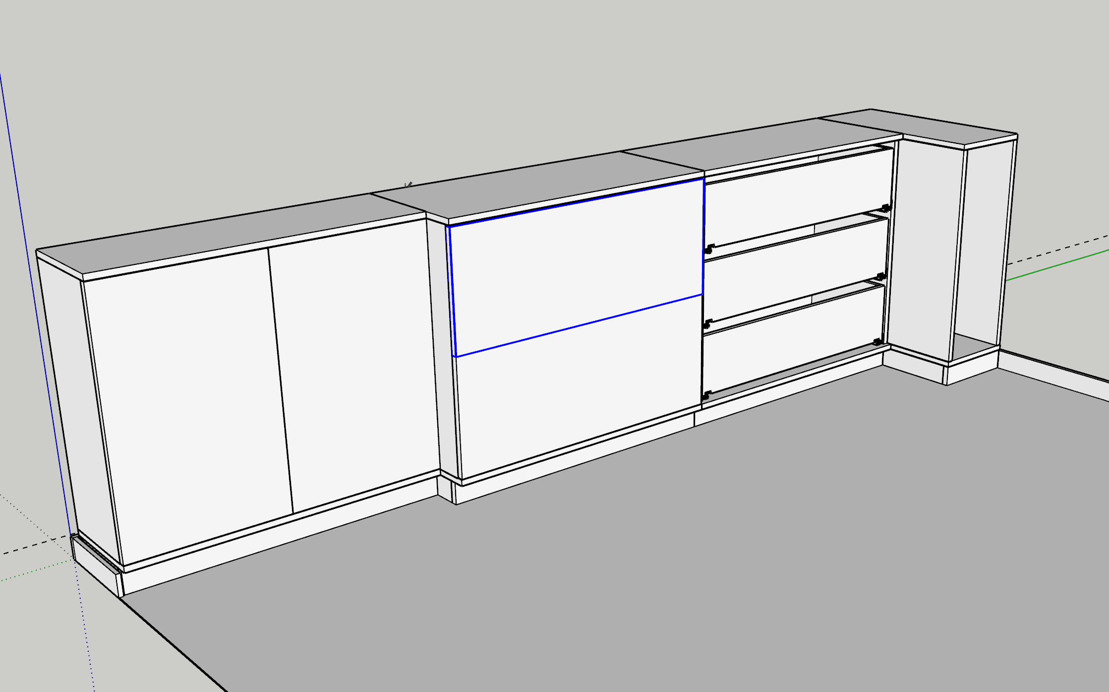 Der Rahmen dieses Schranks hat die gleiche Bauweise wie der Türenschrank – nur kommen hier zwei große Schubladen hinein.