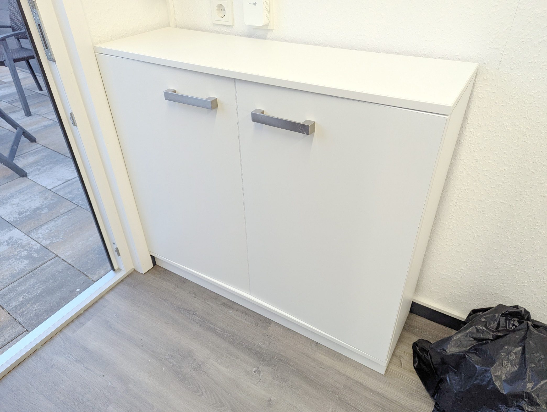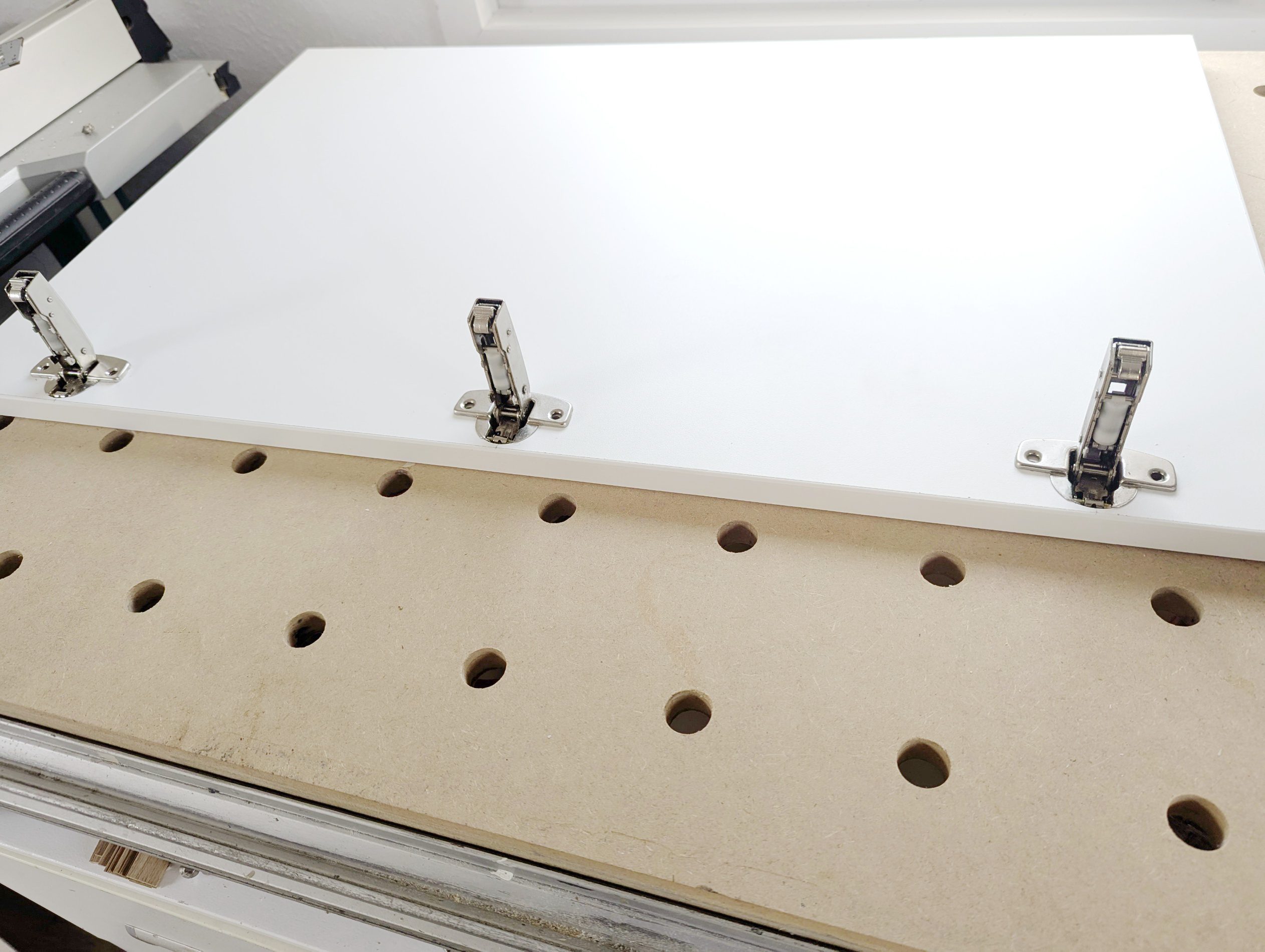 Die Türen sind recht groß und ebenfalls aus 19 mm beschichteter Spanplatte. Ihr Gewicht tragen drei Hettich-Topfbänder mit Dämpfung – ausreichend stabil und langlebig.