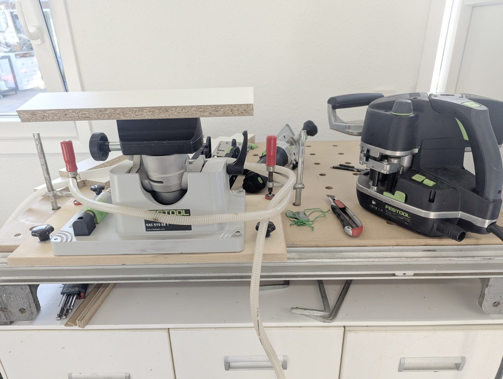Also: VAY-SYS auf die Werkbank, Festool Kantenanleimer KA 65 ans Netz zum Aufwärmen – das dauert immer mindestens sieben Minuten. Dann kann es endlich losgehen.