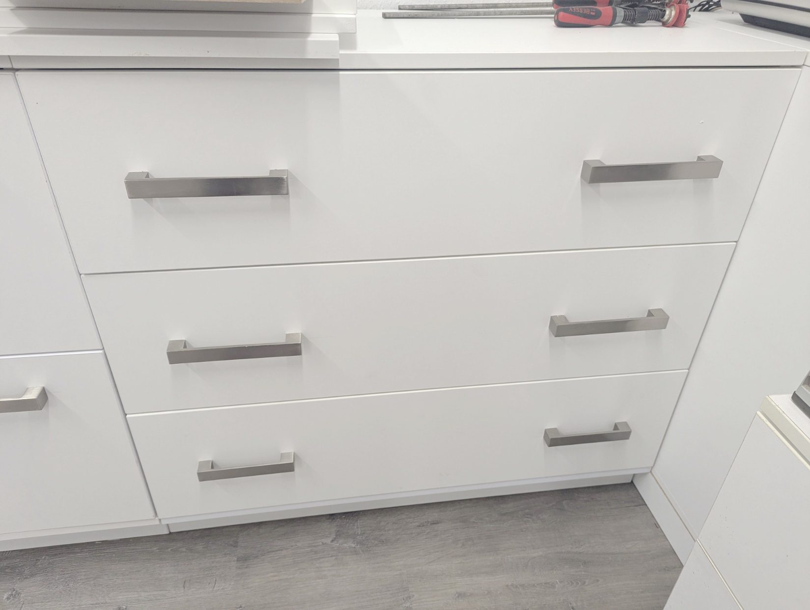 Die Griffe hatte ich ebenfalls noch auf Lager. In einer Werkstatt wirken sie vielleicht etwas ungewöhnlich, erfüllen aber ihren Zweck. Ich habe sie relativ hoch an den Fronten angebracht, damit sich die Schubladen bequem öffnen lassen.