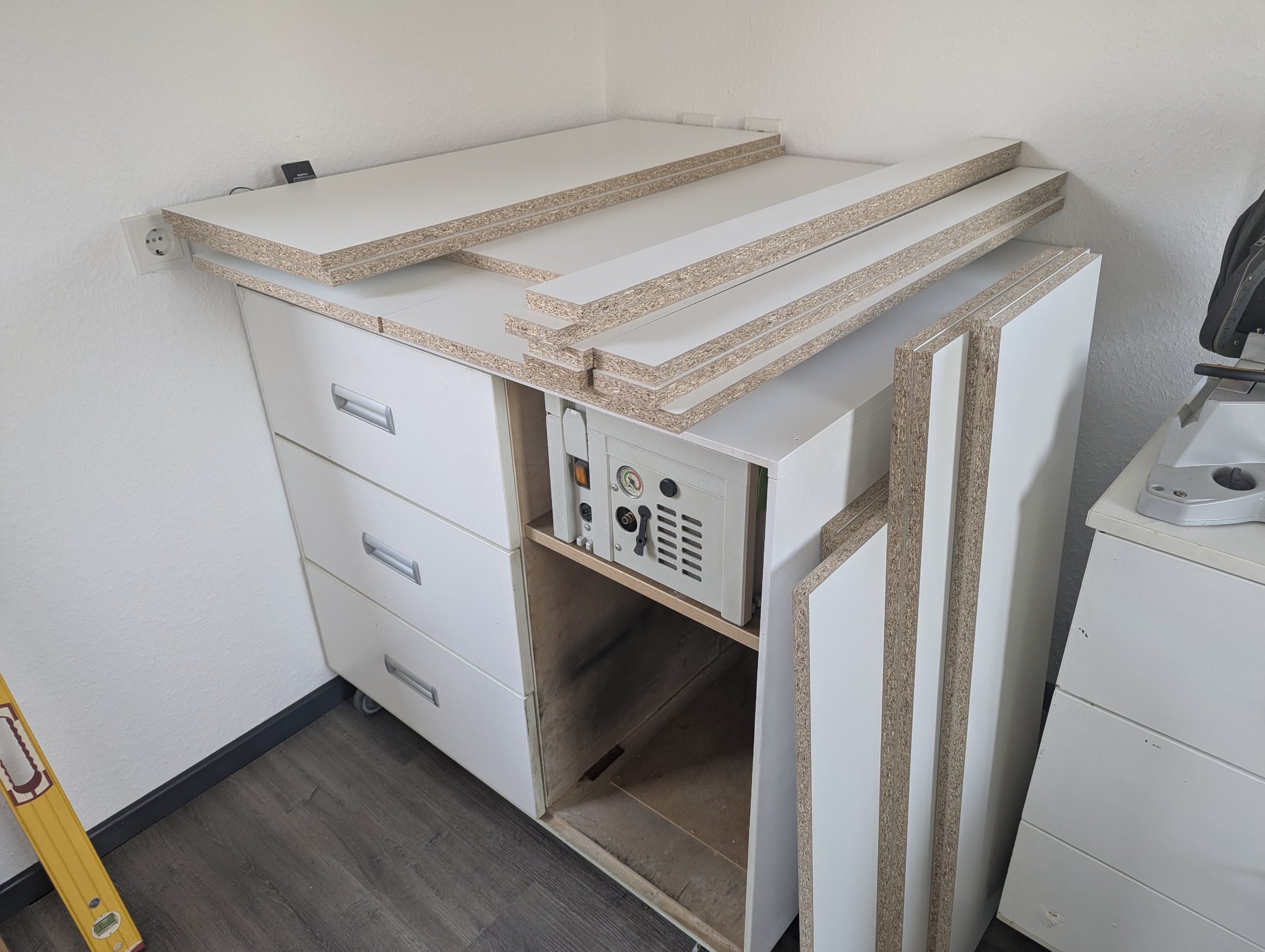 Los ging es mit dem Schrank am Eingang, der zwei Türen erhält. Später folgen Schränke für Schleifmittel, aus eichefurnierter Spanplatte, die anschließend lackiert werden, damit der Staub keine Chance hat. Rollen, Schienen von Hettich und Bügelgriffe sorgen für einfache Handhabung.
