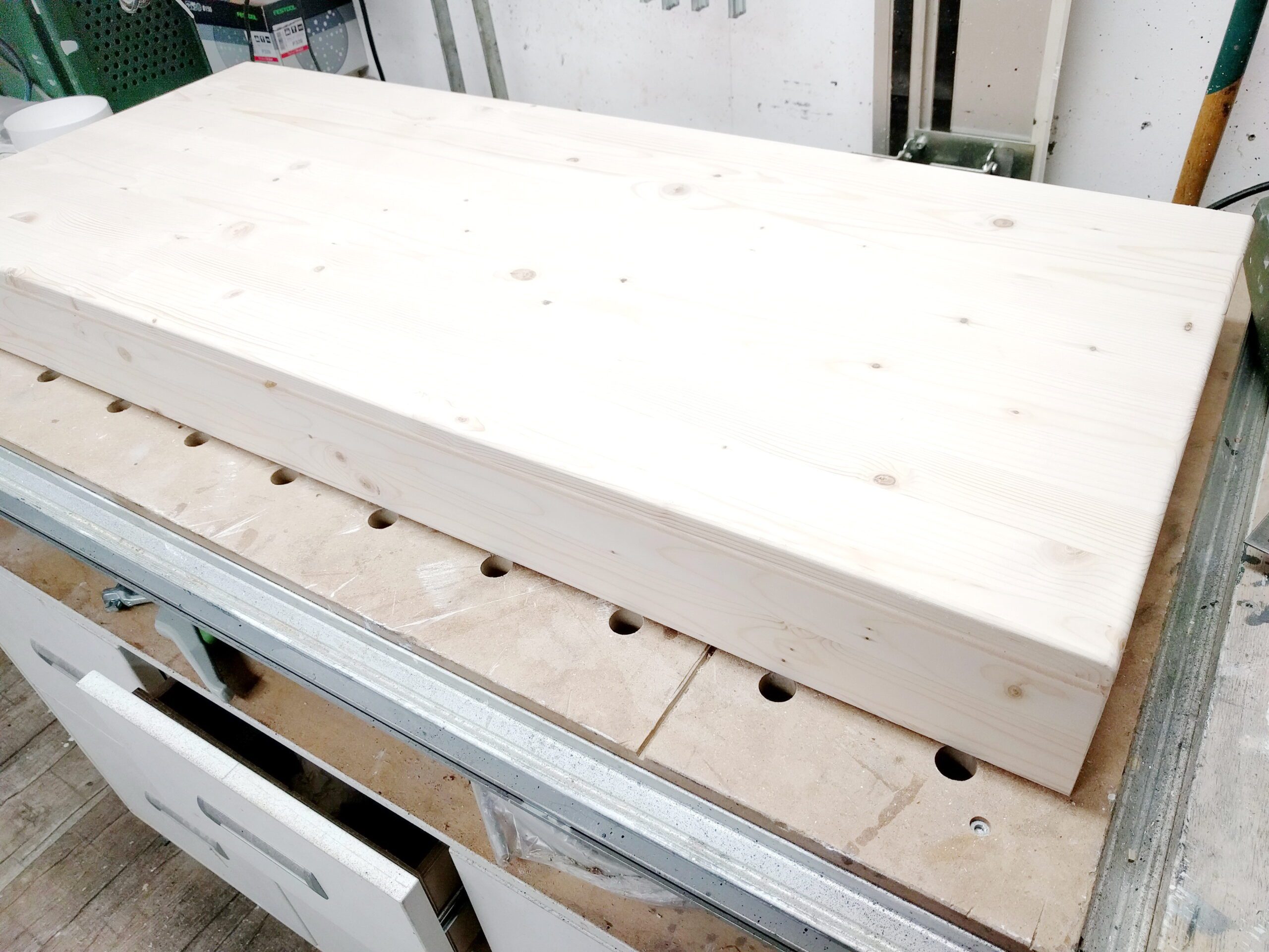 Die Deckplatte des Schrankes soll stabiler aussehen als sie wirklich ist. Deshab dopple ich die Platte mit einem durchgehenden Rahmen.