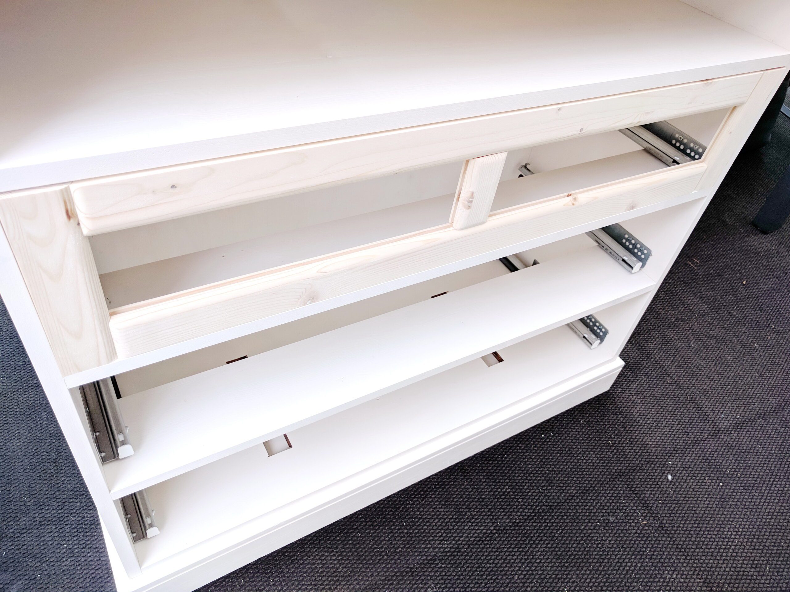Den bau der Schubladen habe ich hier weggelassen. Dafür habe ich genügend andere Beschreibungen hier im Blog. Die Arbeitsweise ist immer gleich. Hier habe ich Schubladen mit Einschiebeboden gebaut.