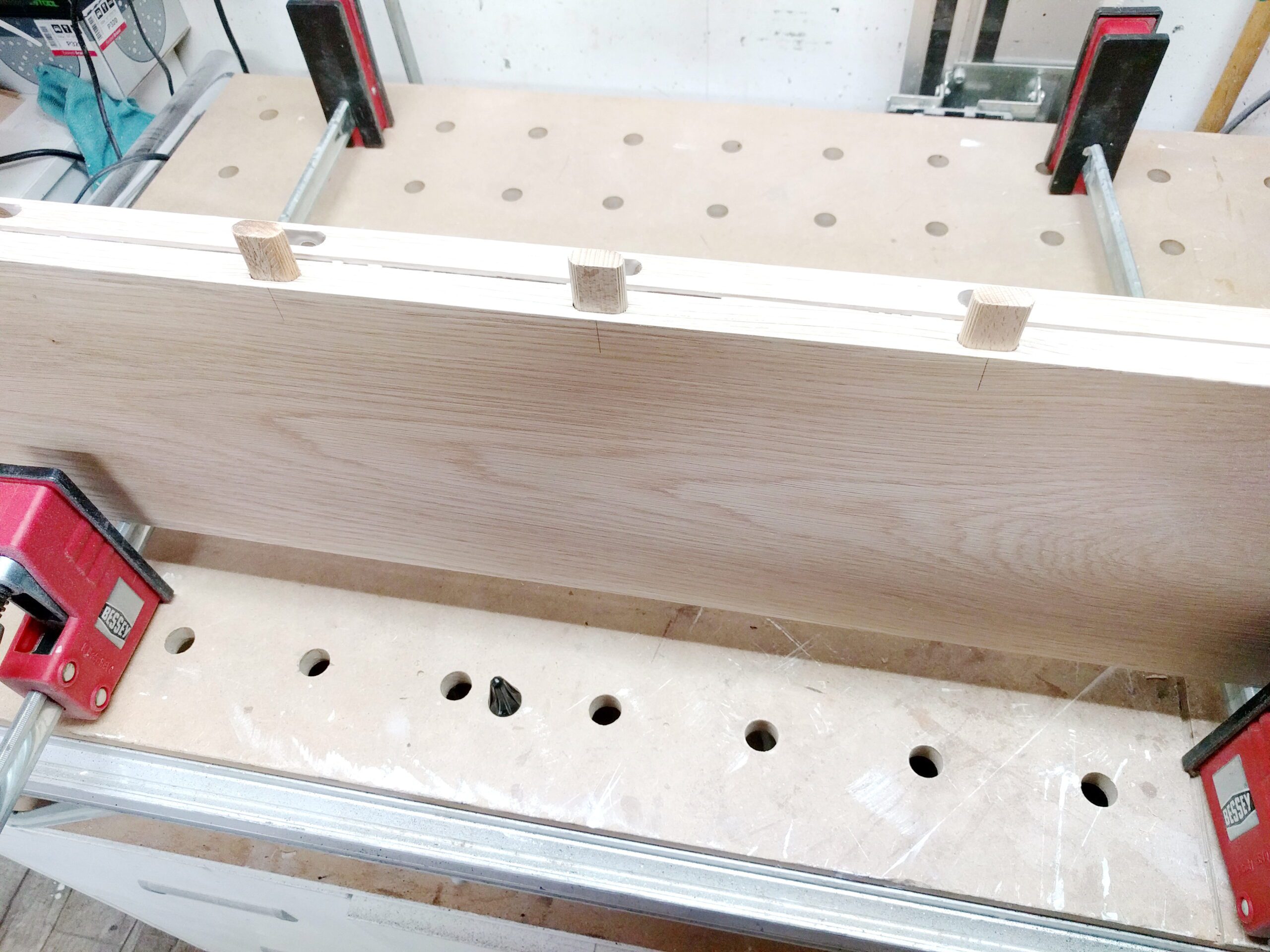 Da ich zu dem Zeitpunkt noch keine langen Korpuszwingen hatte, habe ich improvisiert mit kleinen Ausschnitten in Deckel und Boden. Da passten dann auch die kurzen Zwingen. KEIN guter Kompromis, aber wirksam.