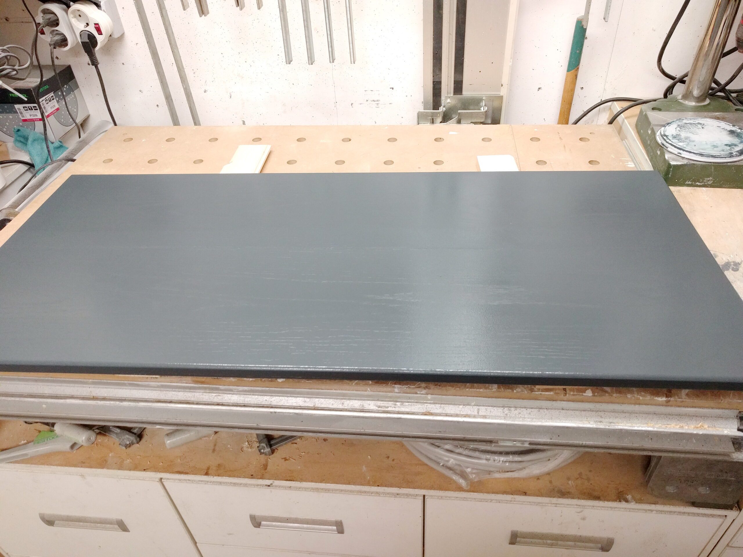 Die Deckplatte habe ich mit OSM-Landhausfarbe anthrazit lackiert. So kommt die Maserung der Eiche sehr gut hervor.