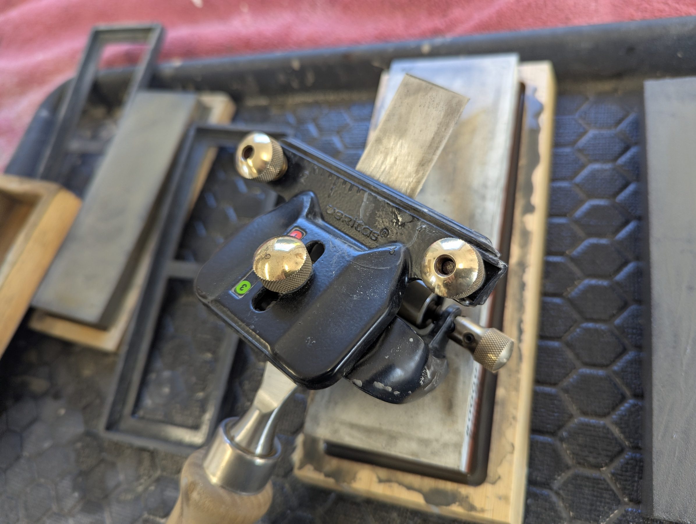 Was macht das Teil? Es hält den Beitel in einem festgelegten Winkel zum Schärfen mithilfe einer Rolle.